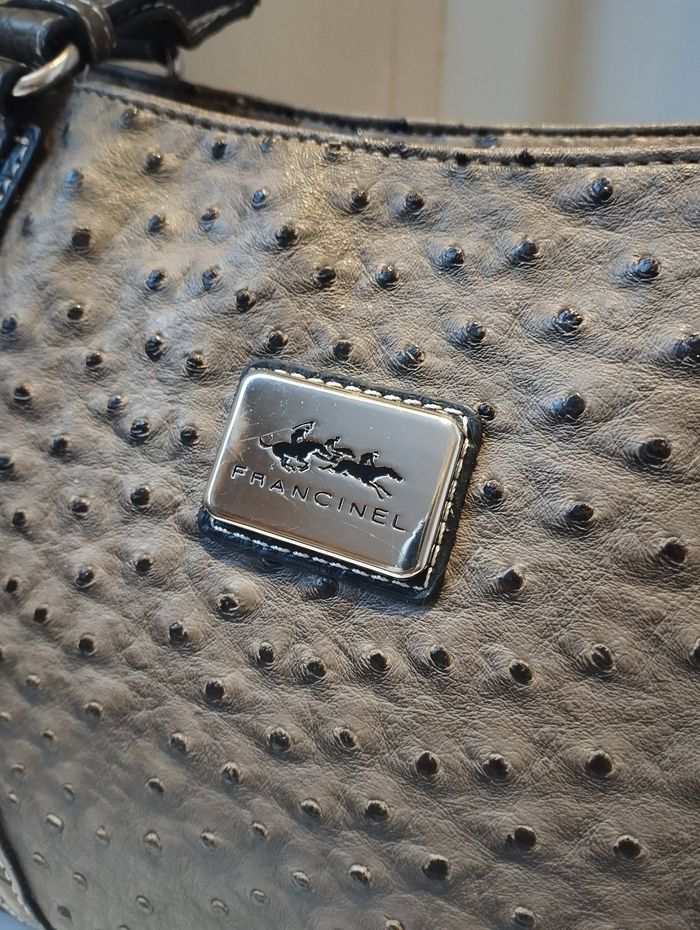 sac à main de la marque Francinel, en simili cuir façon autruche, coloris marron chic et facile à assortir. 📌 Détails : Plaque métallique argentée gravée Francinel à l’avant Deux anses confortables Poche zippée à l’arrière Fermeture éclair sur le dessus 📦 Intérieur soigné : Doublure beige monogrammée Francinel Deux grands compartiments séparés par une poche centrale zippée D’un côté : 2 poches plaquées De l’autre : 1 poche zippée 📏 Dimensions : largeur 38 cm – hauteur 25 cm 💼 État : excellent dans l’ensemble, avec de très légères faiblesses à la base des anses (peu visibles et n’altérant pas l’usage). Un sac pratique au quotidien, spacieux et élégant, idéal pour le travail comme pour les sorties. N’hésitez pas à me contacter pour plus de photos ou d’informations !
