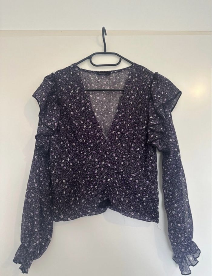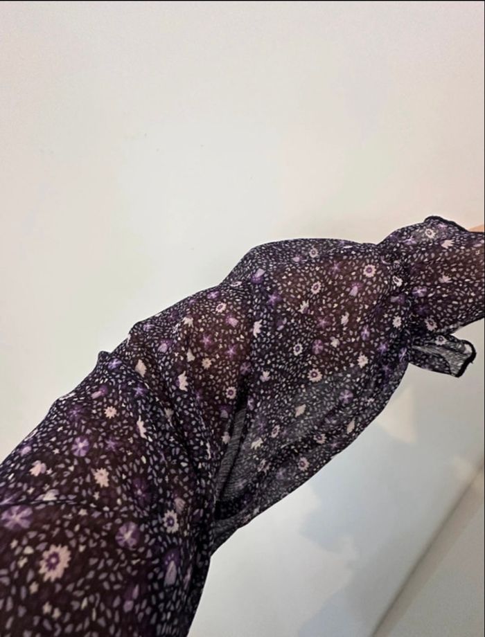💜 Top Bizbee violet à imprimé fleuri, coupe féminine avec décolleté en V et manches longues légèrement transparentes. Matière fluide, agréable à porter. Idéal avec un jean taille haute. 🔹 Très bon état 🔹 Style bohème / chic 🔹 Parfait mi-saison