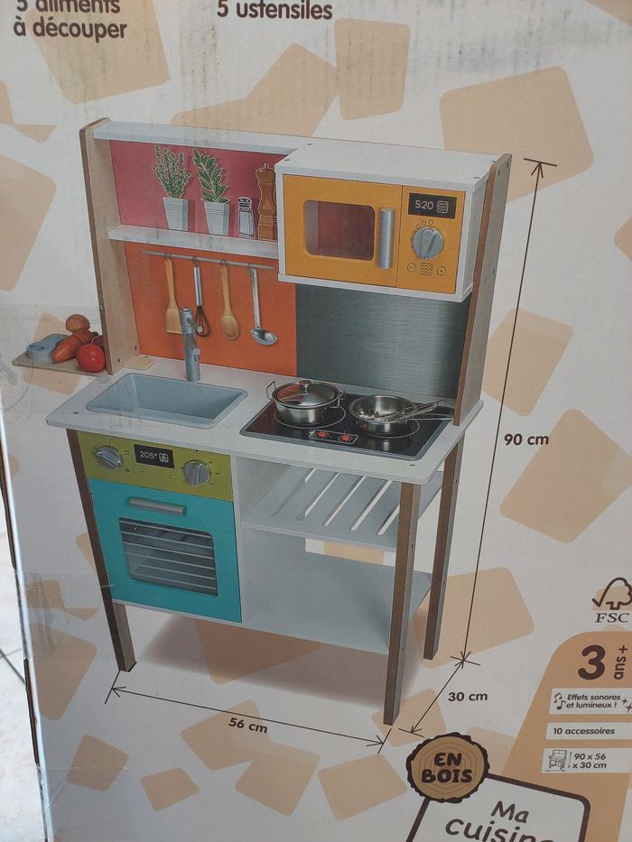 Bonjour Je vends cette cuisine en bois Marque kidway Neuve Des 3 ans Effets sonores et lumineux 10 accessoires Hauteur 90 cms Largeur 30 cms Longueur 56 cms Envoi possible mais pas de locker