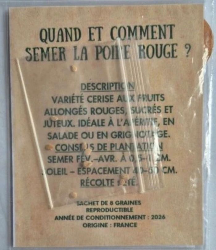 Semences potagères – usage amateur uniquement 👉 Collection idéale pour les amateurs de tomates cerises sucrées, colorées et très productives, parfaites pour le potager comme pour la culture en bac. Cette sélection réunit 5 variétés de tomates cerises reconnues pour leur saveur, leur originalité et leur abondance. 🌟 Contenu de la collection 🍅 Poire rouge 🍅 Poire jaune 🍅 Bosque Blue 🍅 Ida Gold 🍅 Barbaniaka 📦 8 graines par variété ➡️ 40 graines (minimum)au total ✅ Pourquoi choisir cette collection ✔️ Tomates cerises anciennes et originales ✔️ Fruits sucrés, juteux et colorés ✔️ Très productives ✔️ Idéales à l’apéritif ou en salade ✔️ Potager, balcon ou serre 🌱 Conseils de culture Semis : février à avril Exposition : plein soleil Repiquage après les gelées Récolte : été 📌 Conditionnement soigné Sachets individuels + cartes illustrées avec conseil semis 🗓️ Année de conditionnement : 2026 🎁 Idéal pour : jardiniers amateurs amateurs de tomates cerises culture en pot ou balcon idée cadeau potager ⏳ Stock limité – collection premium 💬 N’hésite pas à me contacter pour toute question #tomatescerises #tomatesanciennes #graines #semences #potager #jardinage #jardinamateur #potagerurbain #cultureenpot #balcon #tomatesrare #collectionpotager