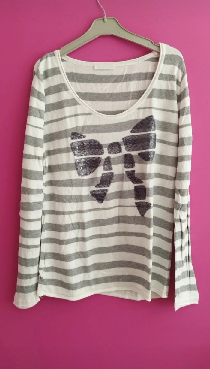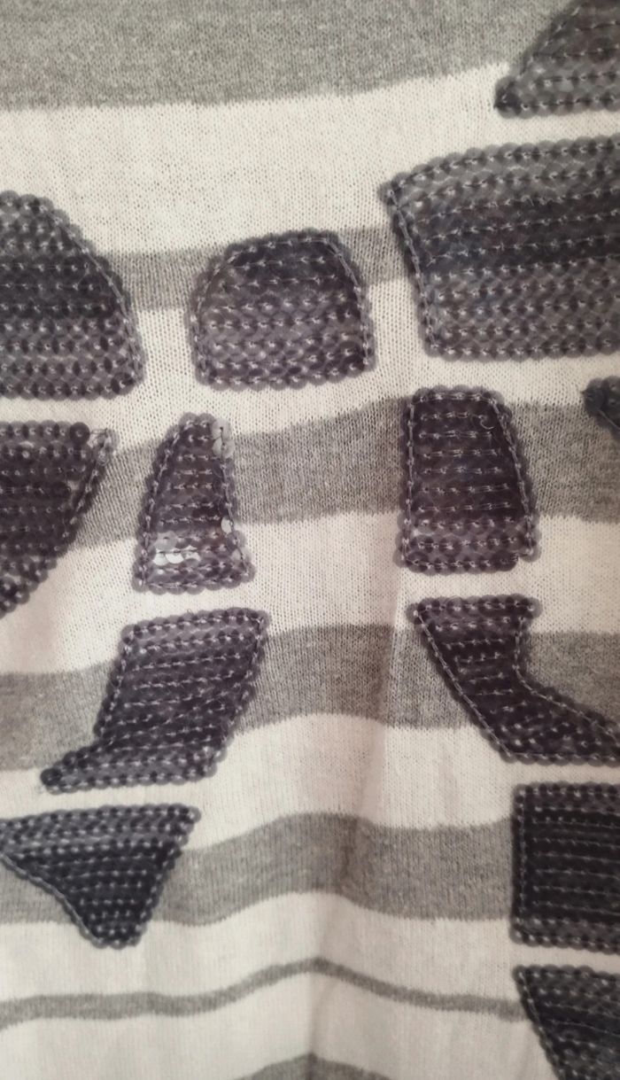Pull fin à rayures et sequins gris et blanc. Marque promod Taille 4. Porté mais en très bon état. #pull #pullfemme #pullfin #femme #pullxl #taille4 #taillexl #promod #gris #blanc #pullpromod #pullpromodxl #pullpromodtaille4 #pullpromod42 #promodtaille4 #promodxl #promod42 #sequins
