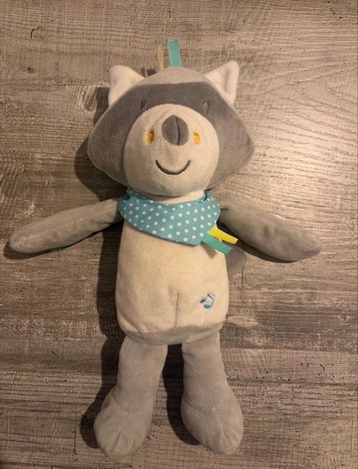 Doudou musical qui aide à un endormissement apaisé grâce aux lumières et aux bruits blancs. Très peu servi, une étiquette un peu effilochée sur une patte (voir photo)