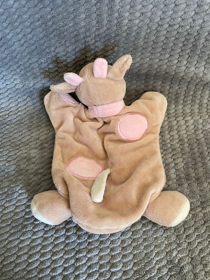 Doudou plat marionnette vache girafe beige En broderie rose un papillon et des rond Bébé 9 Occasion en très bon état Vous achetez le doudou que vous voyez sur la photo