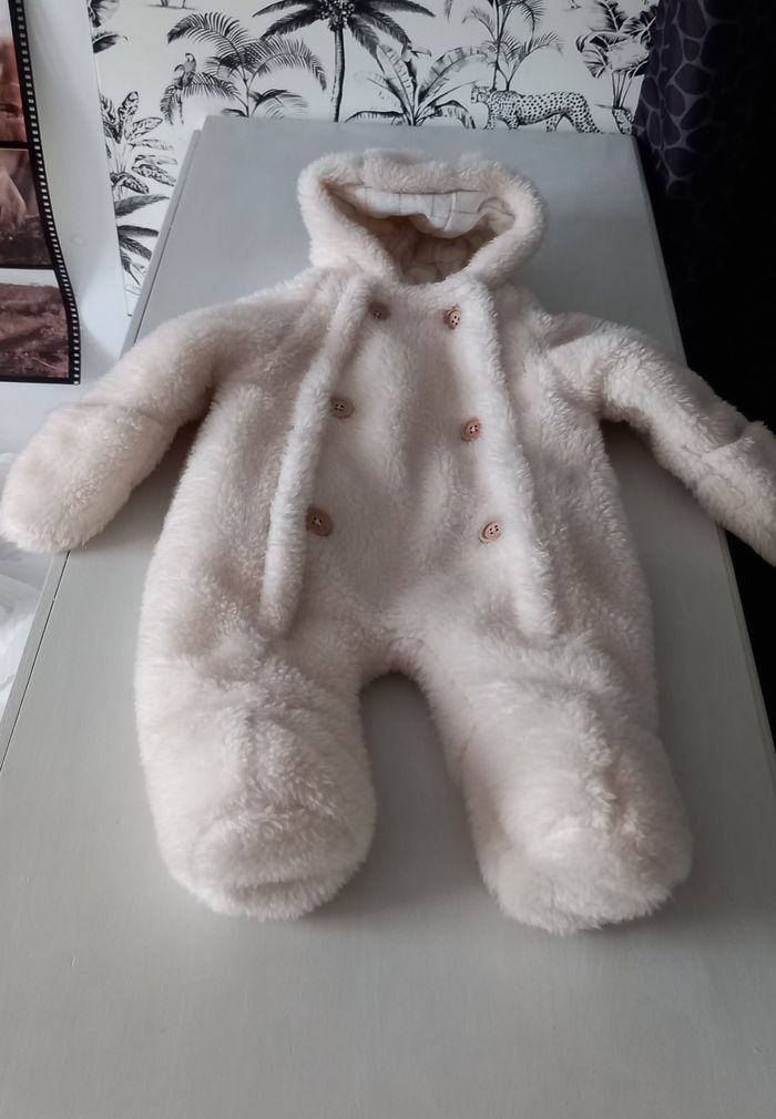 Combipilote crème Kiabi 3 mois Extérieur fausse fourrure Intérieur capuche tissu carreaux Très chaude Double fermeture éclair devant Boutons beige foncé pour déco Taille 3 mois / 60 cm Jamais portée Excellent état #enfants_imoddeco
