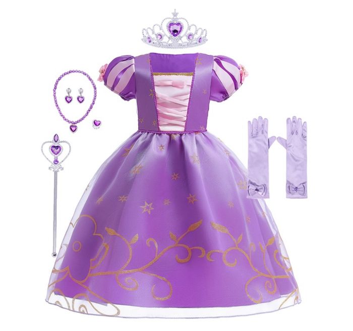 Déguisement robe princesse raiponce et ces accessoires (gant, couronne, baguette, bijoux). 1 taille disponible : - 5-6ans : longueur de la robe 90cm, Vendu dans leur pochette d’emballage d’origine, idéal pour faire un cadeau ! Expédition rapide après votre commande.
