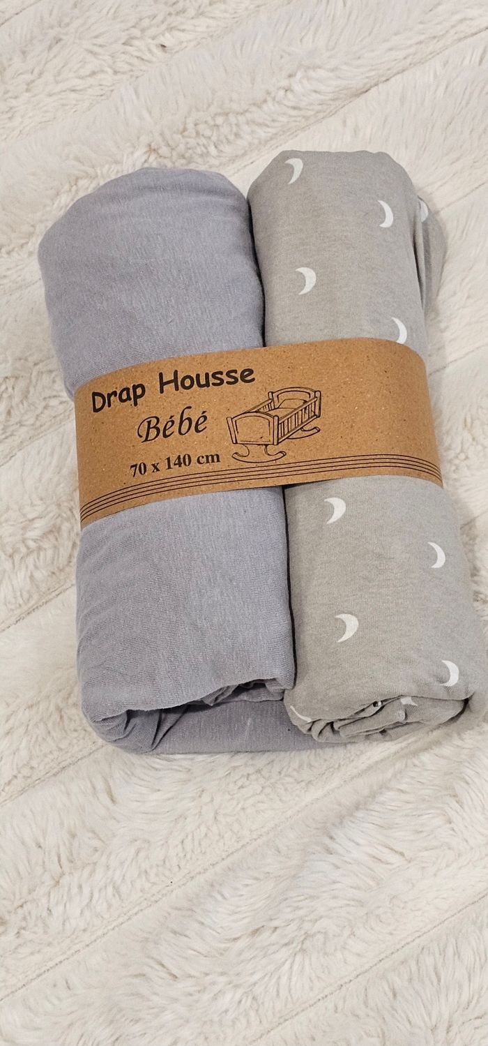 Lot de 2 draps housses 100% coton. Tissage bien serré. Un drap uni & un drap motifs de lune. Dimension 70×140 cm. Neuf.