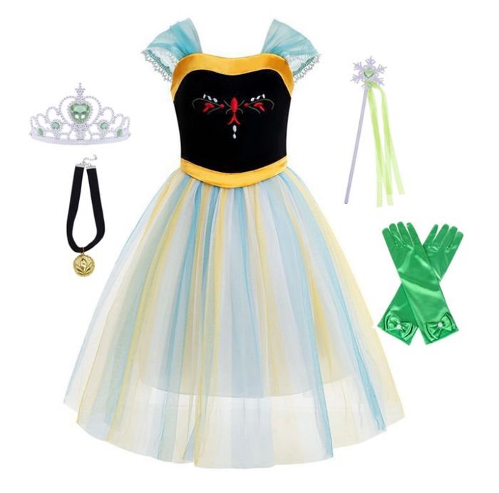 Déguisement robe princesse Anna verte et jaune et ces accessoires (gant, couronne, baguette, collier). 1 taille disponible : - 5-6ans : longueur de la robe 85cm, Vendu dans leur emballage d’origine, idéal pour faire un cadeau ! Expédition rapide après votre commande.
