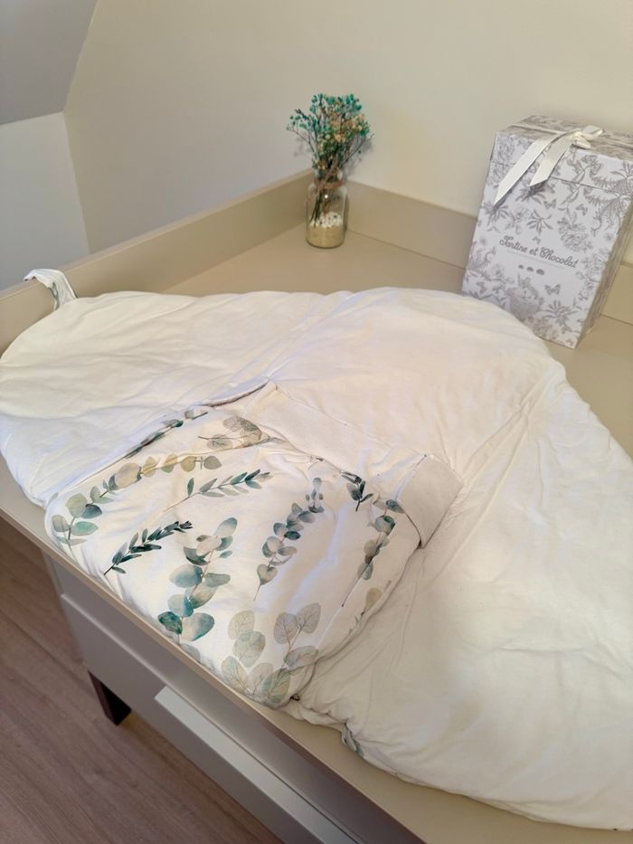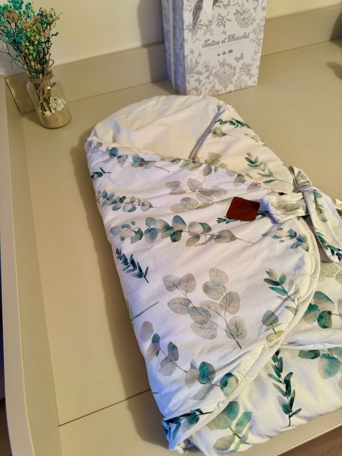 Gigoteuse d’emmaillotage bébé Idéal naissance Très bon état, comme neuve très peu servie Marque Servira Kids, fabrication française 100% coton Motif eucalyptus