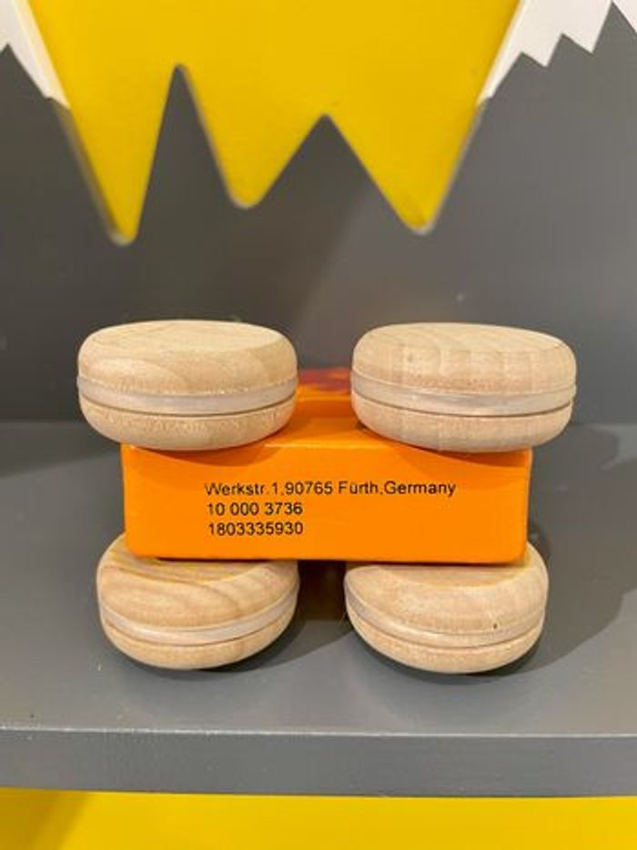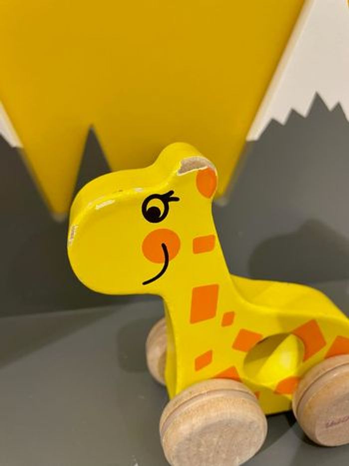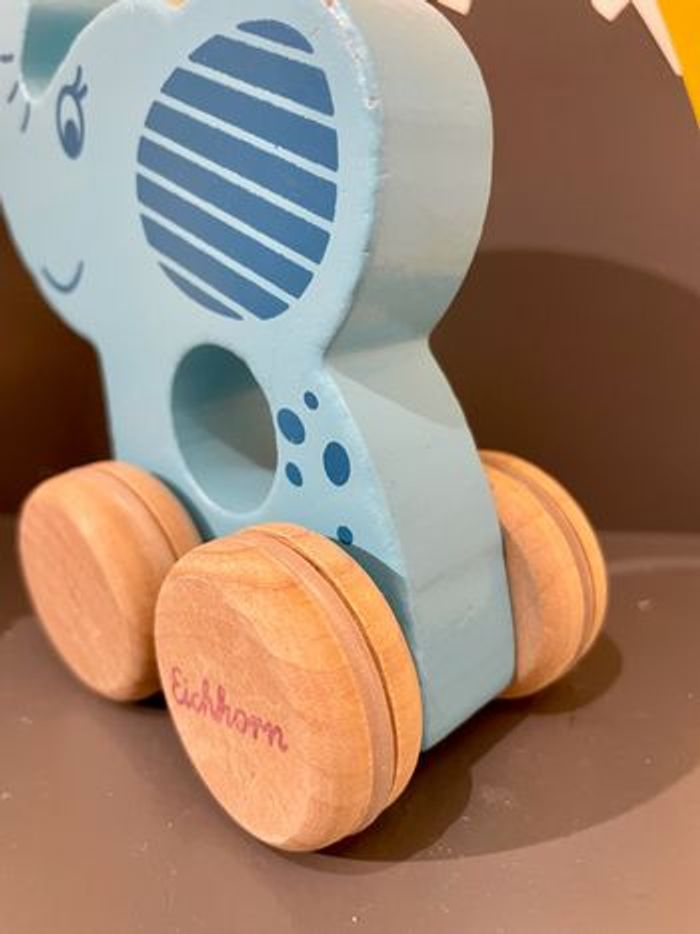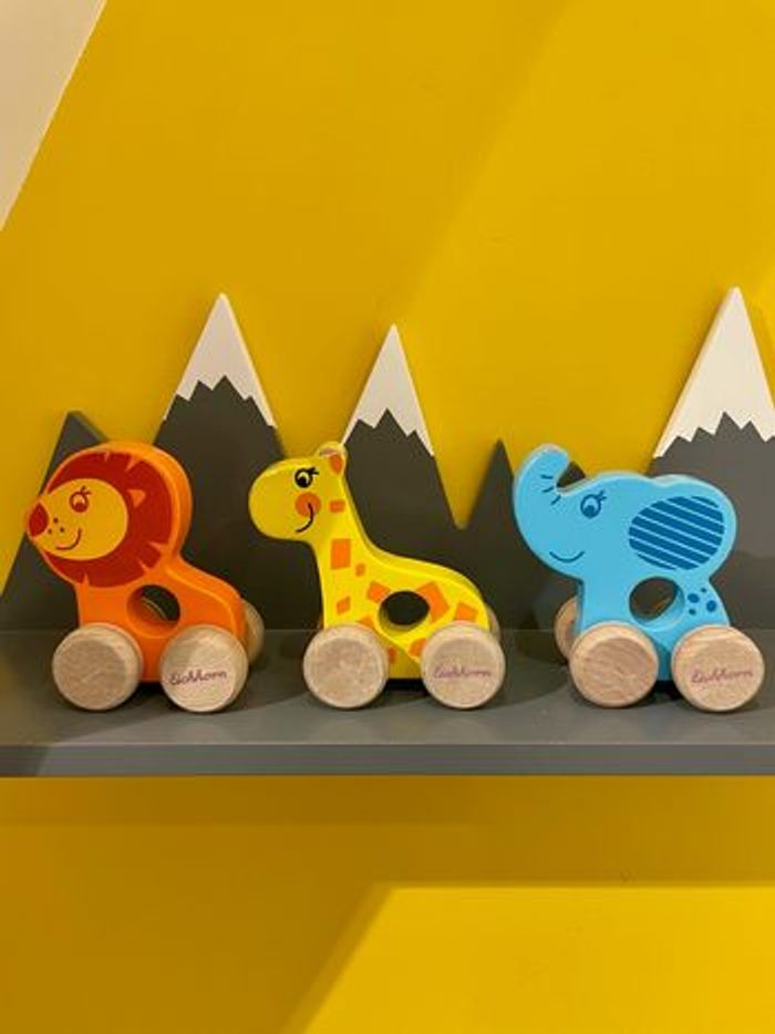 Lot de 3 animaux en bois à pousser de la marque Eichhorn. Une girafe, un lion, un éléphant. Roues équipées de cerclage en silicone pour plus de sécurité. Quelques traces d'usure (voir photos). Dimensions : L11 x P6 x H10 cm
