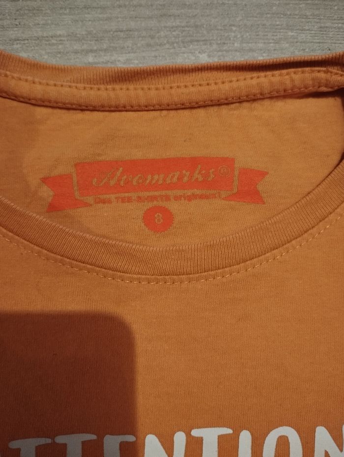 Tee shirt orange avec message. Marque avomarks taille 8 ans.