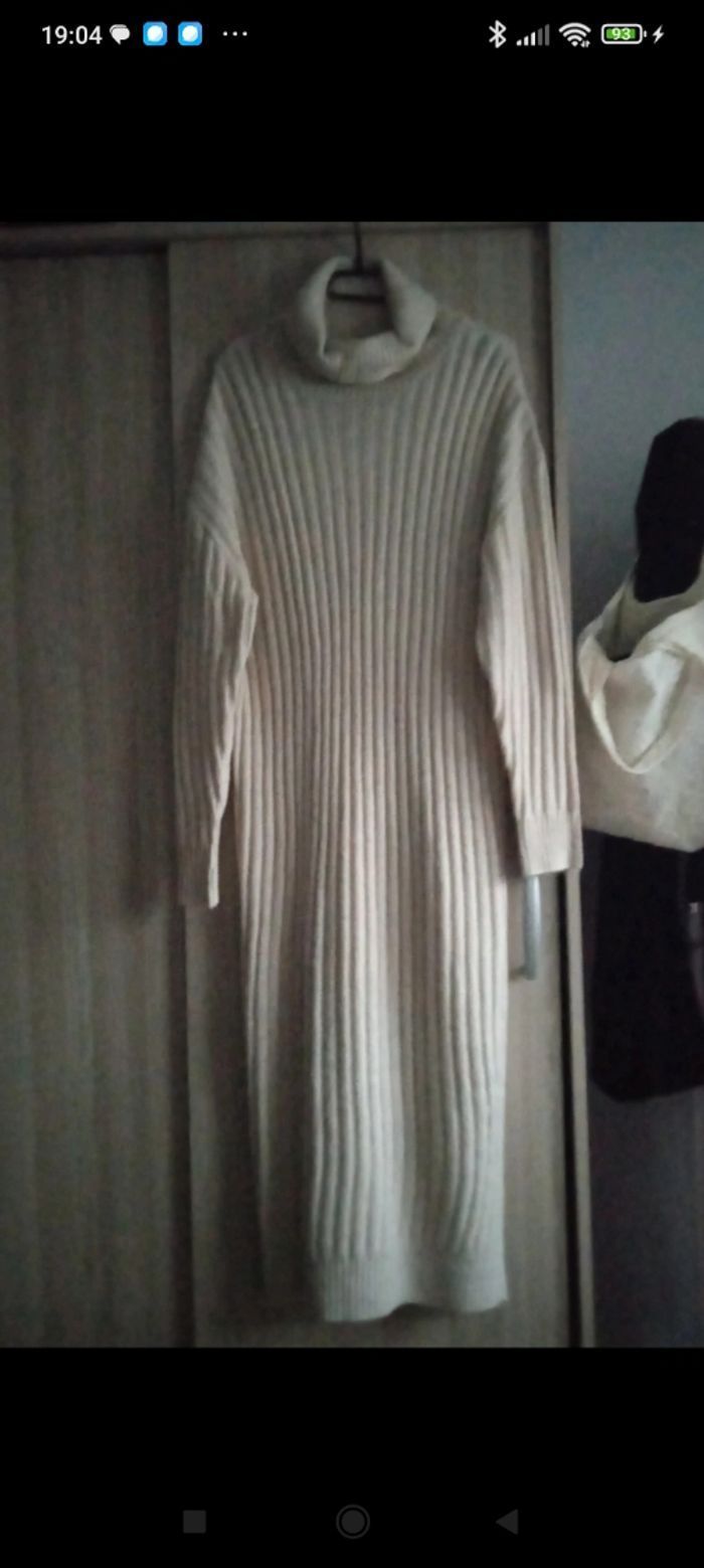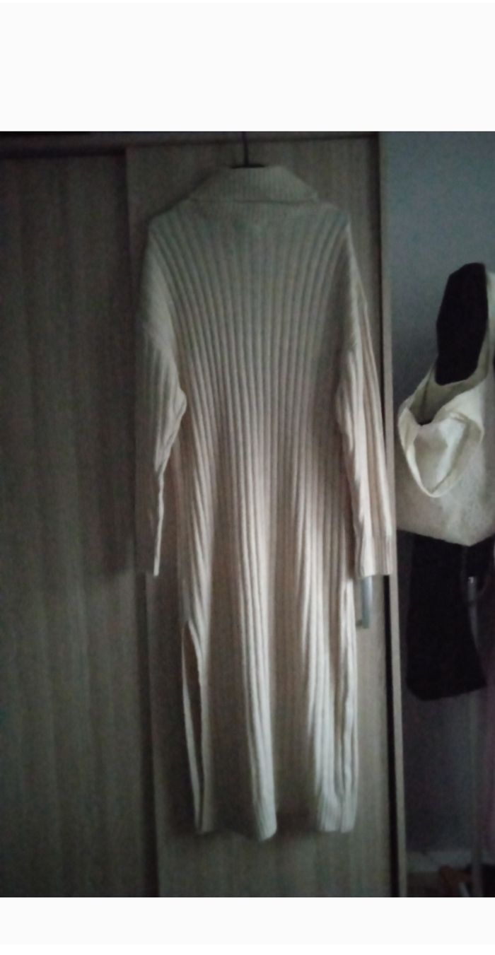 Bonjour je vends une jolie robe pull longue couleur crème stylée avec sa fente sur le côté la laine est douce confortable chaude parfait avec les bottines couleur crème ou beige que je vends dans mon dressing.
