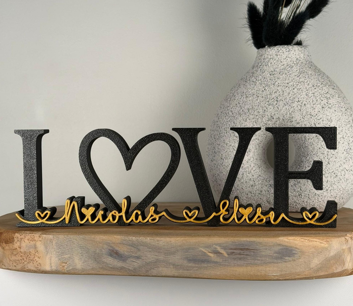 ❤️ Mot à personnaliser selon vos idées et vos envies, illustré avec LOVE + prénoms ⚠️ Merci de m'indiquer si vous désirez un aperçu du rendu avant impression ! 🎉 Parfait pour offrir en cadeau d'anniversaire, de Noël, Saint-Valentin etc.. 🪛 100% fabriqué dans mon petit atelier en France, j'utilise l'impression 3D comme support puis le tout est assemblé à la main 🌿Imprimé en PLA (bio-plastique, issu d’amidon de maïs) 💡 Évitez l'exposition directe au soleil : Bien que le PLA soit résistant, l'exposition prolongée au soleil peut entraîner une dégradation à long terme. Utilisez-le de préférence à l'intérieur ou protégez-le des éléments extérieurs. Nettoyage en douceur : Nettoyez les pièces imprimées avec un chiffon doux et évitez les solvants agressifs qui pourraient endommager la surface. Chaque pièce est unique et imprimée en 3D avec la plus grande attention et le plus grand soin, mais peut présenter de très légères imperfections. Largeur d'environ 24cm, hauteur pour l'exemple LOVE 7.4cm, varie légèrement en fonction du lettrage. Les points des i ï etc seront automatiquement remplacés par un seul cœur par défaut.