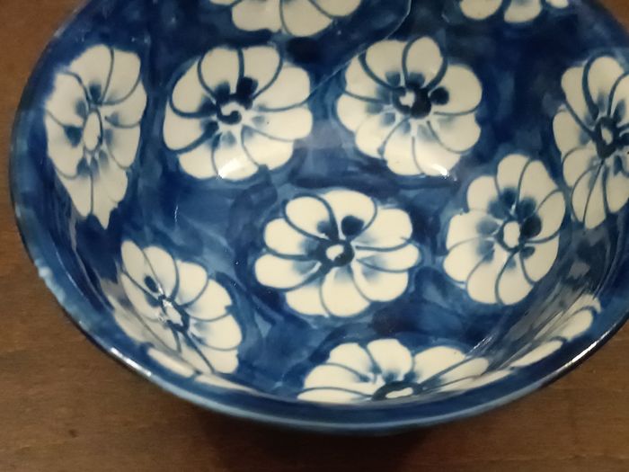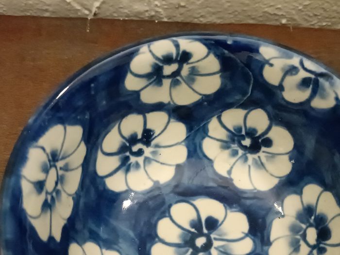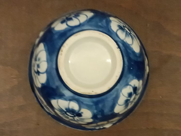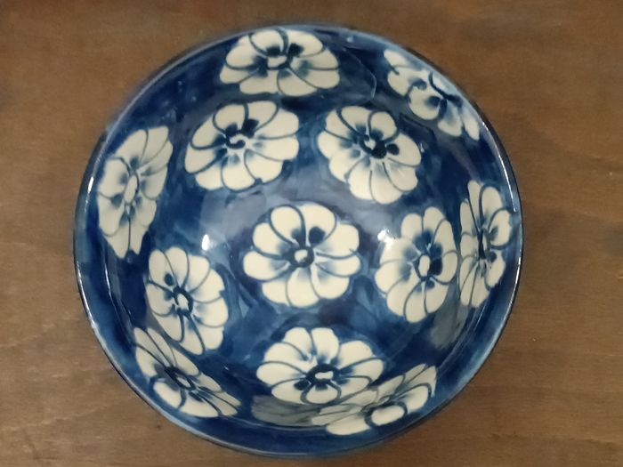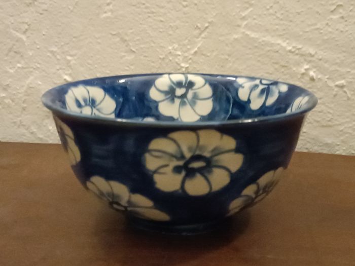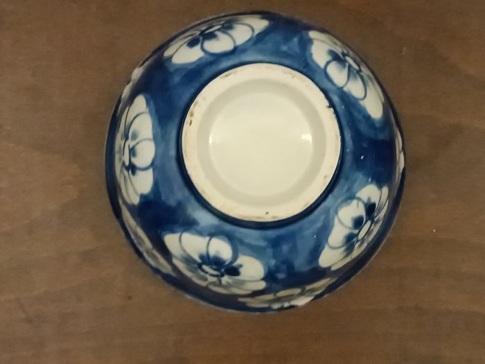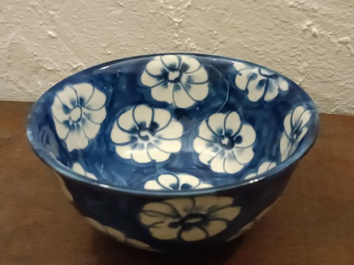 Grand bol ou petit saladier en porcelaine blanc bleu à décor floral hauteur 9 cm diamètre 18,5 cm bon état cf photos
