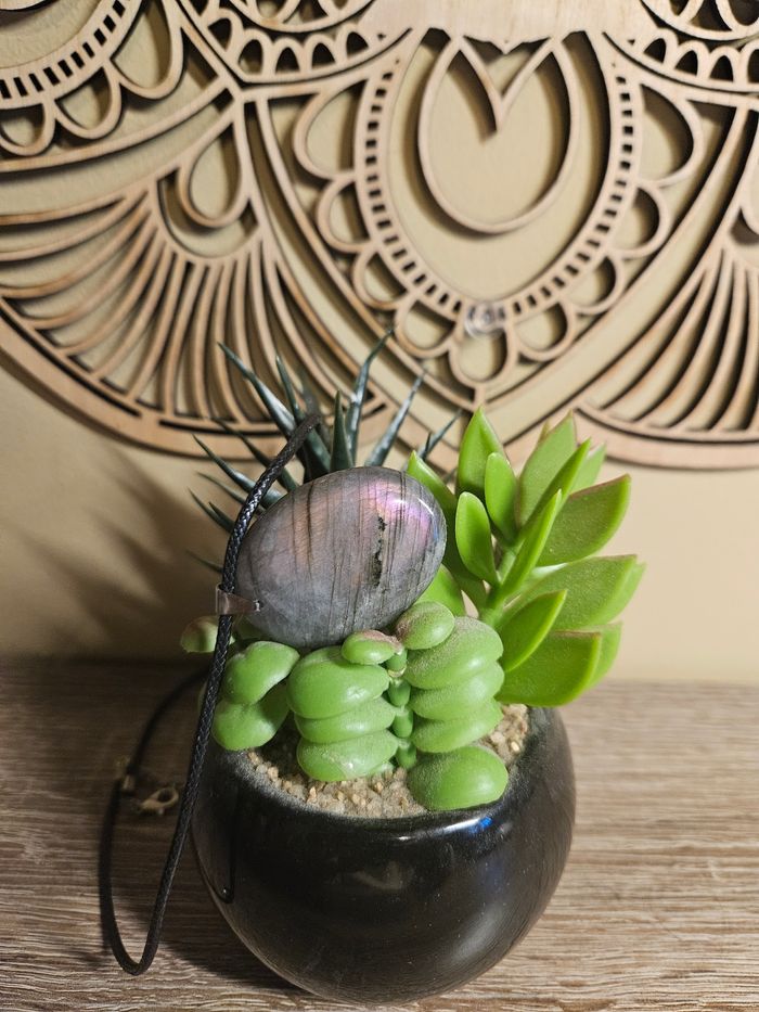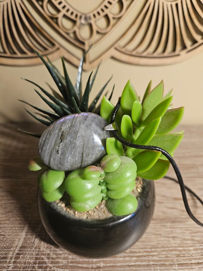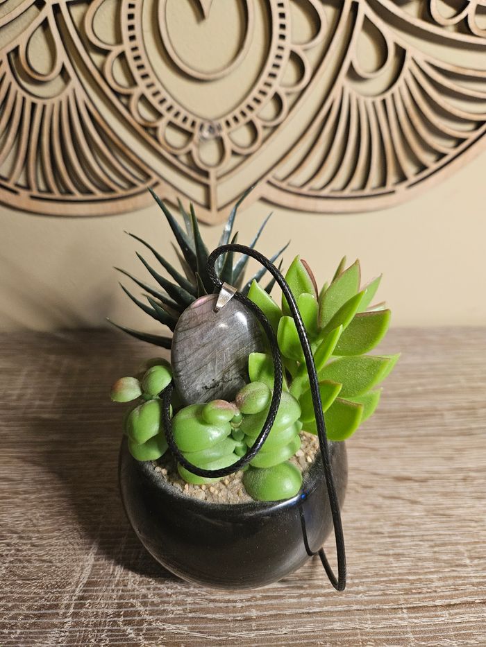 Bonjour voici un pendentif en labradorite violette . En qualité A. Il mesure entre 35 et 45 MM. Il aura son cordon et vont pochon. Bonne soirée.