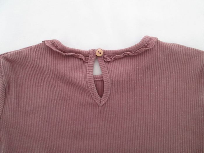 Vends tee-shirt Zara vieux rose à manches longues. Petit volant autour du cou. 57 coton + 39 % polyester + 4 % élasthanne. Taille 86 cm. Très bon état. Pour plus de choix, allez consulter mes autres annonces.