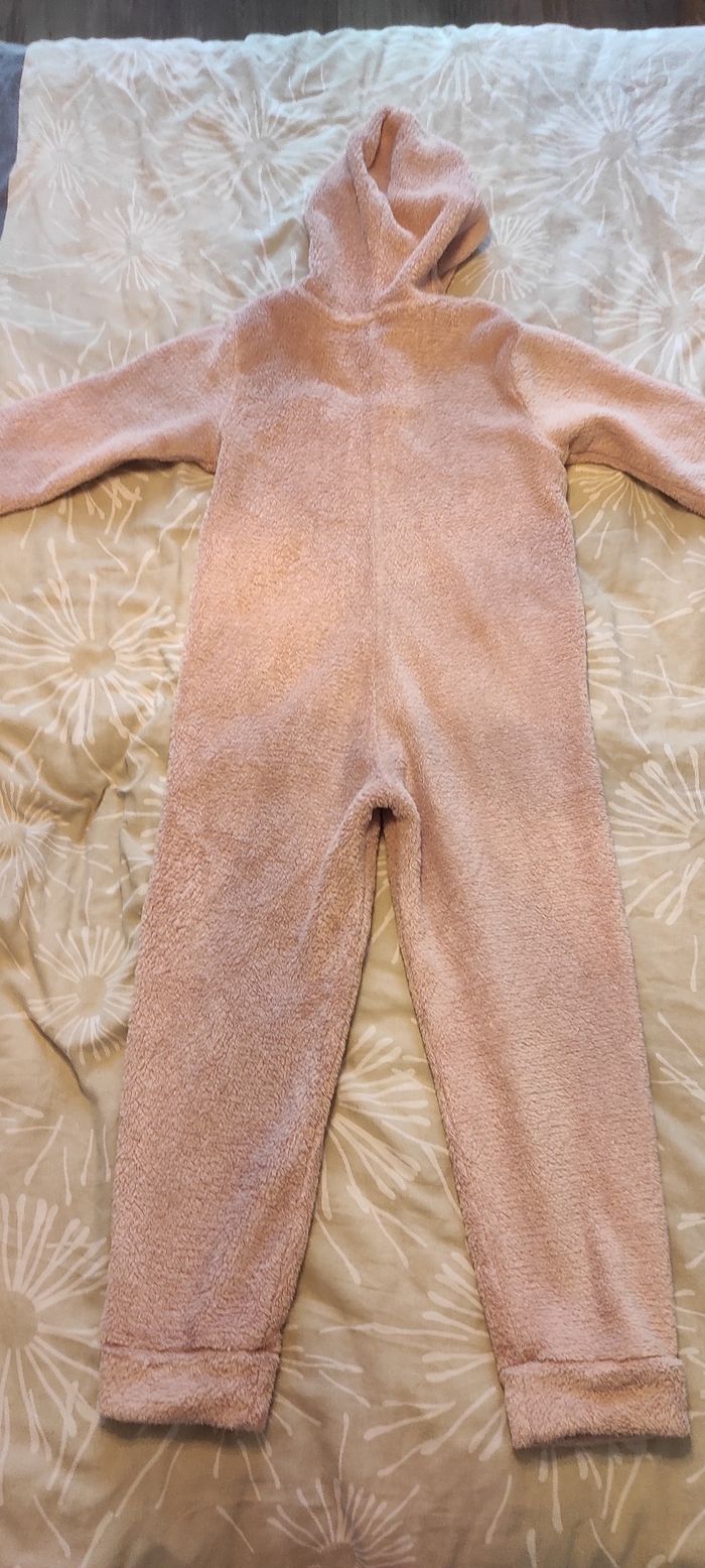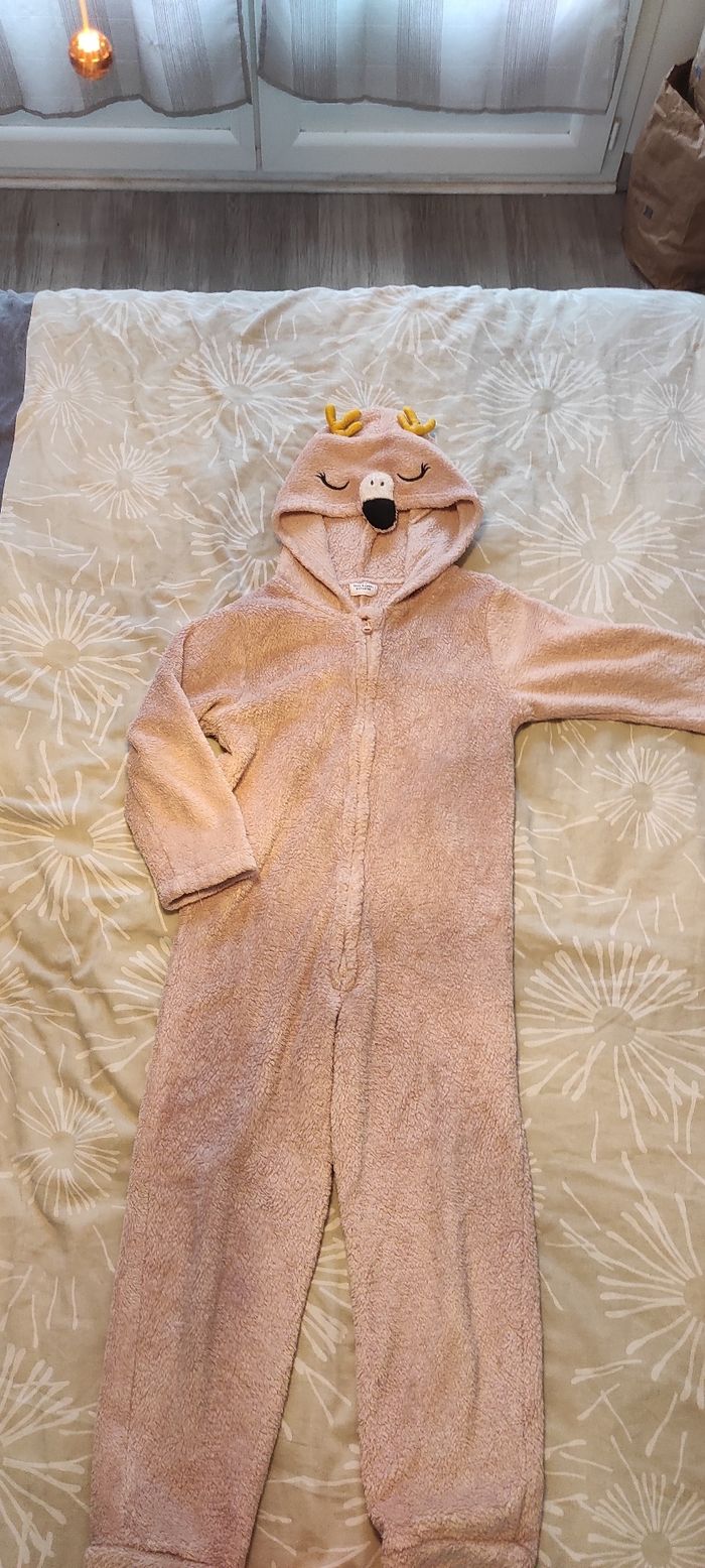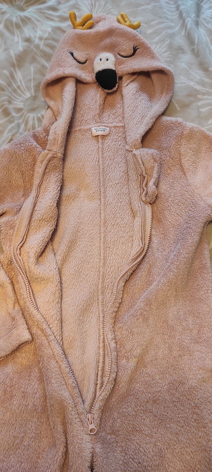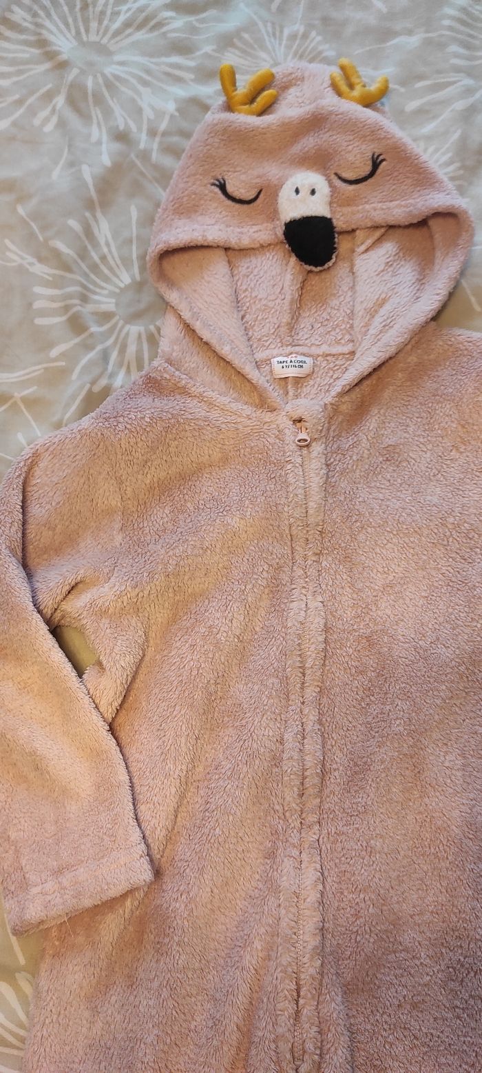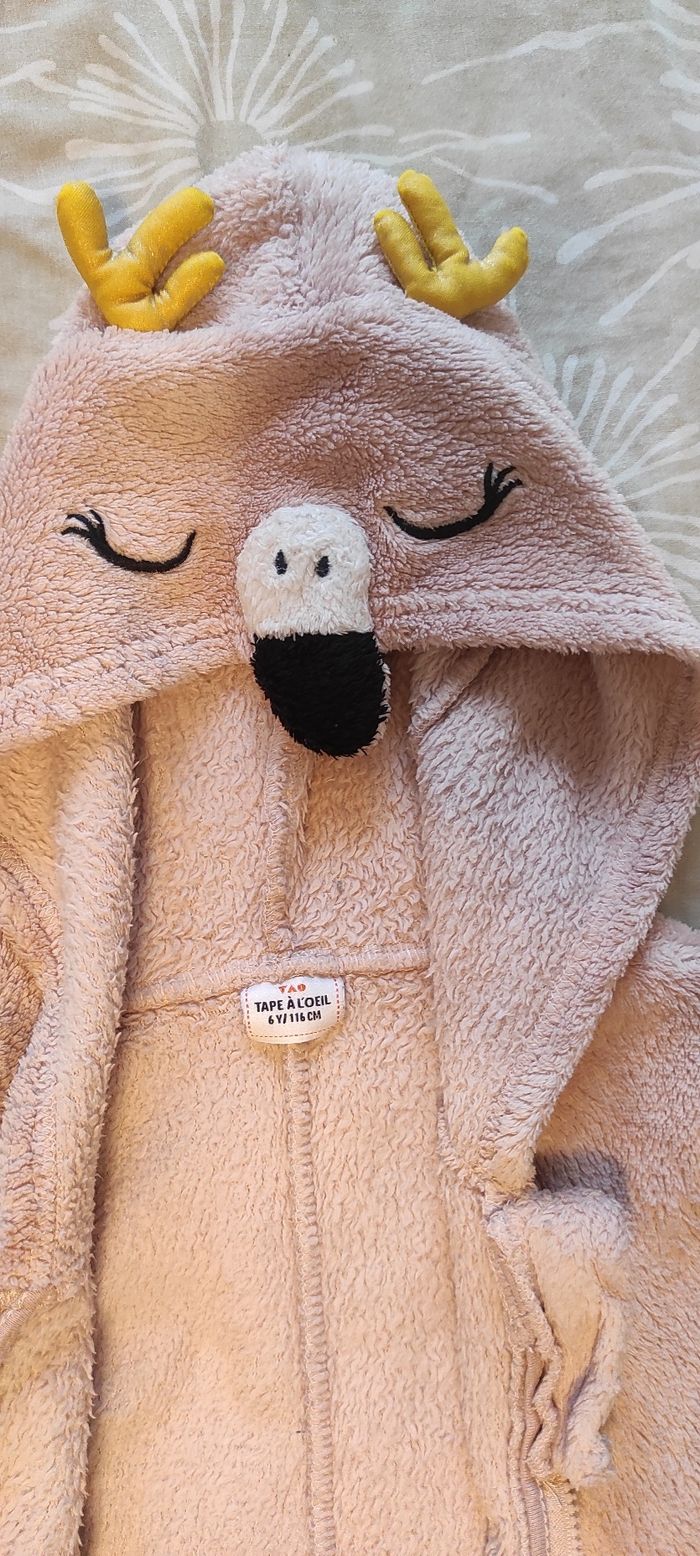 Combinaison polaire toute douce (surpyjama) Fermeture éclair sur le devant Pieds ouverts Capuche flamand rose (on pense que c'est un flamand rose car il y a un bec mais je ne sais pas quel animal c'est vraiment, peut-être un renne? car il y a des bois ?) Tape à l'oeil 6 ans Très bon état Pensez aux lots : réductions activées