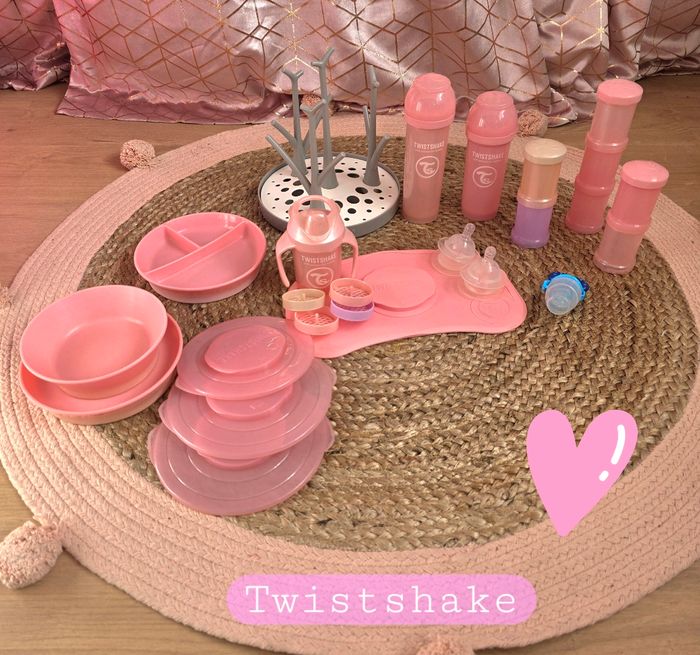 Lot twistshake bébé fille rose Égouttoir biberons 2 biberons roses tétine biberons 1xS 2xM 2xL Set de table pour accrocher assiette 3 assiettes bon état (2 classique 1 compartimenté) 3 couvercles pour les assiettes 1 tasse a bec Une sucette grignoteuse 7 doseurs lait Super lot naissance, début des repas !