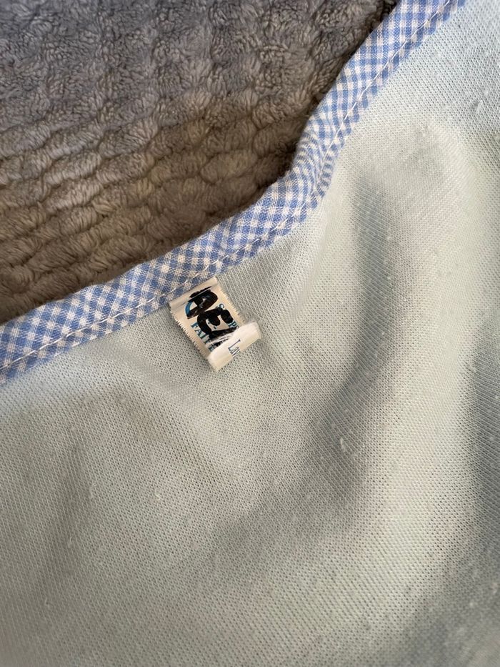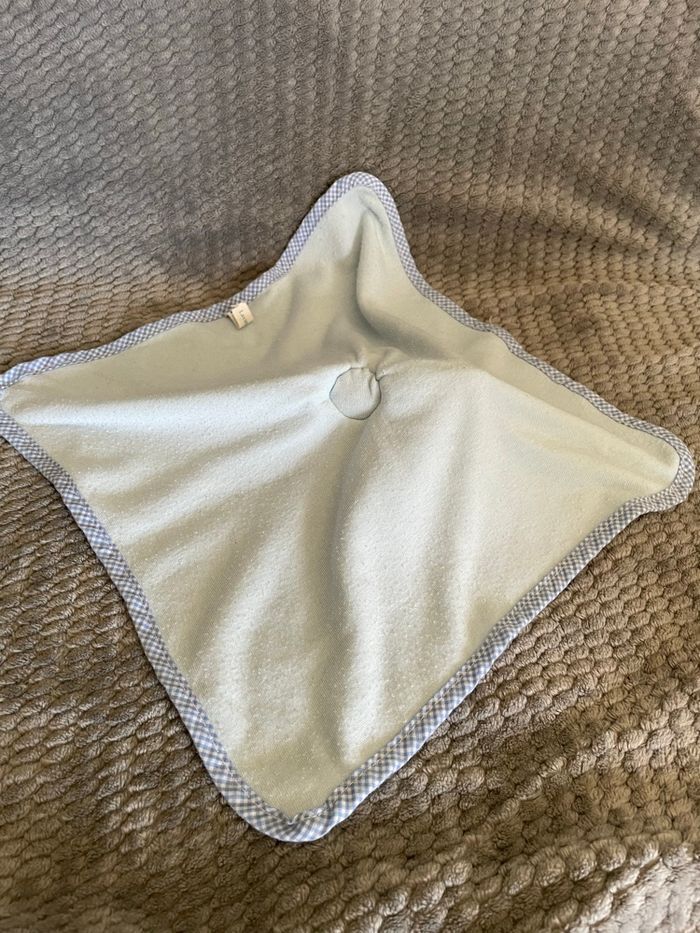 Doudou plat ours marron bleu Autour du cou un noeud en satin +/- 35cm Simpson trading Occasion ( ⚠️ petite tâche, un peu bouloché et un ancien prénom écrit sur l’étiquette) Vous achetez sur le doudou que vous voyez sur la photo.