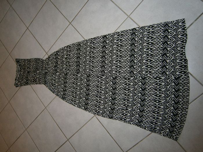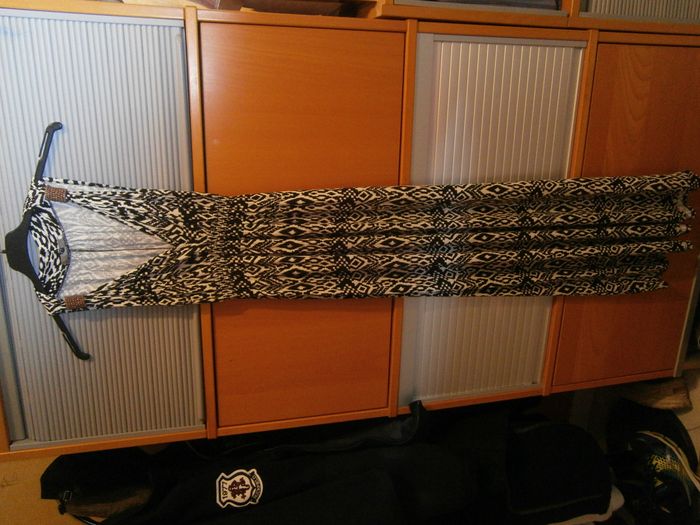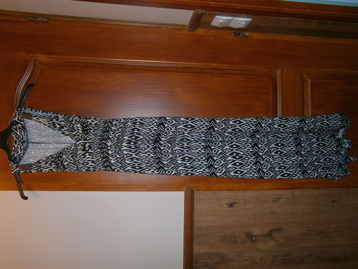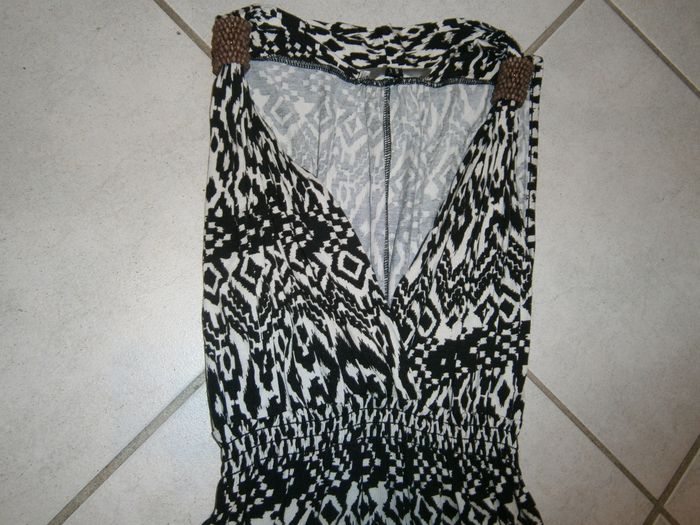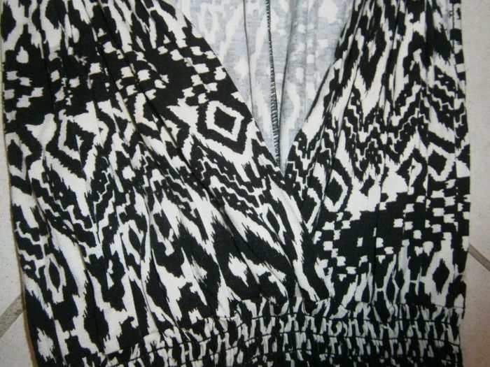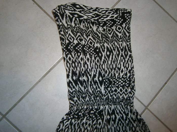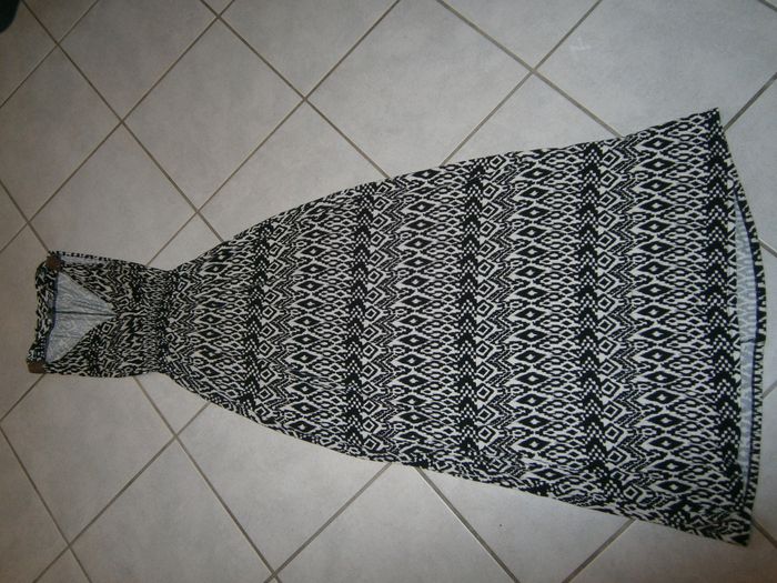 Robe longue sans manches. Couleur noire et blanche. Motif "grafique". Marque KIABI Woman. Beau croisé sur la poitrine. Taille élastique. La partie élastique marque la taille haute, entre le croisé poitrine et la taille, elle est située sur l'estomac. Perles en bois au épaule (photo). Composition : 96% viscose. 4% élasthanne. Dimensions : Aisselle/aisselle = 37 cm. Epaule/bas = 127 cm. Tour de taille non étirée = 40 cm. Taille 36/S