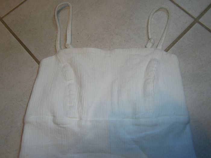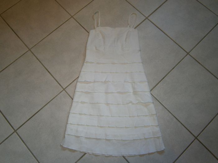 Robe à volants. Bretelles réglables. Couleur blanc. Dos élastiqué. Fermeture éclair sur le côté gauche avec un bouton de finition. 100% coton. Dimension : Aisselle/bas = 59 cm. Taille M/38.