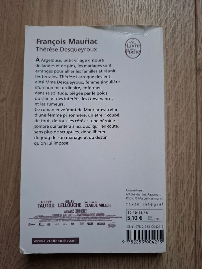 Roman Thérèse Desqueyroux de François Mauriac en bon état Éditions Le livre de poche Pour éviter le scandale et protéger les intérêts de leur fille, Bernard Desqueyroux, que sa femme Thérèse a tenté d'empoisonner, dépose de telle sorte qu'elle bénéficie d'un non-lieu. Enfermée dans sa chambre, Thérèse tombe dans une prostration si complète que son mari, effrayé, ne sait plus quelle décision prendre. Doit-il lui rendre sa liberté ? Histoire bouleversante, poignante.. Prix d'achat 5.10 euros