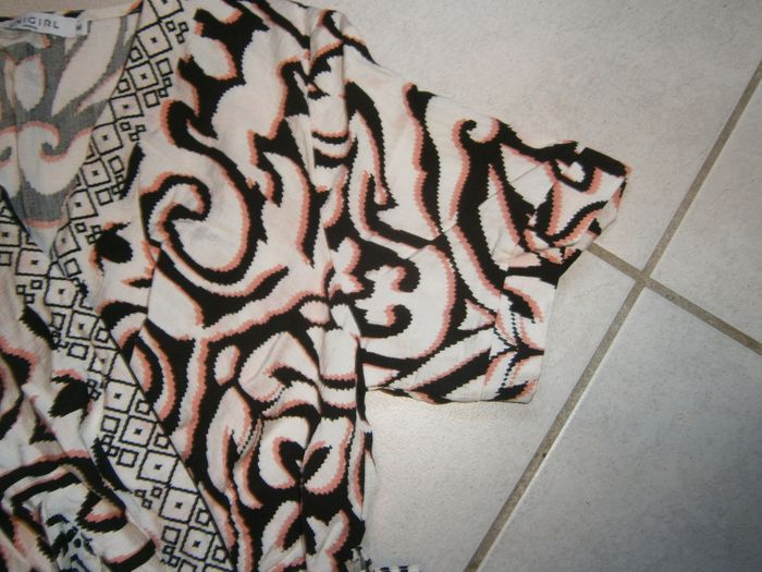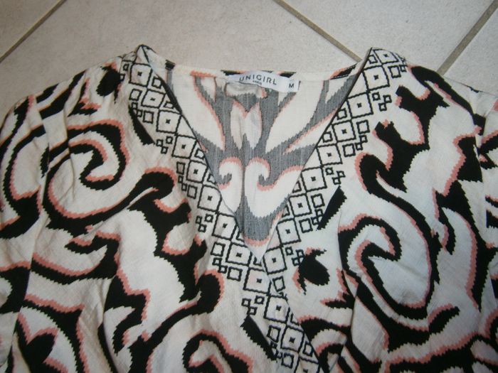 Robe longue à manches courtes. Marque UNIGIRL PARIS. Forme croisé devant, à hauteur de la poitrine. Forme en V. Ceinture en tissu avec dessins géométriques. Couleur beige avec motifs noir et rose. Taille élastique au dos. Fendue sur le bas du côté gauche sur 35,50 cm. Composition : 75% viscose, 25% polyamide. Dimensions : Tour de Taille = 76 cm. Epaule/épaule = 40 cm. Aisselle/aisselle = 47 cm. Epaule/bas = 117 cm. Taille 38. Neuve. Jamais portée, uniquement lavée.