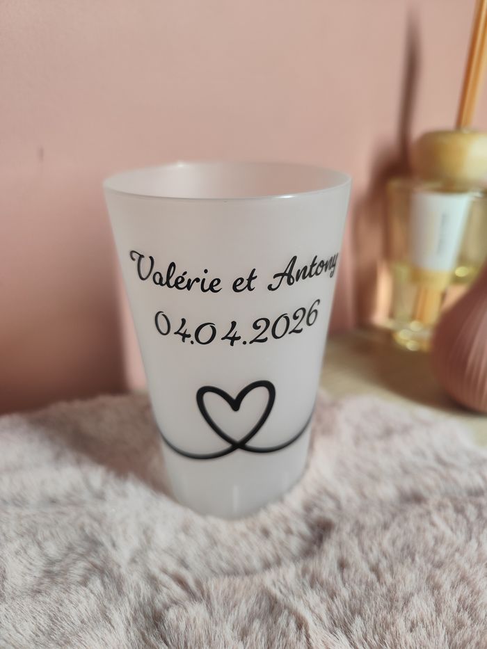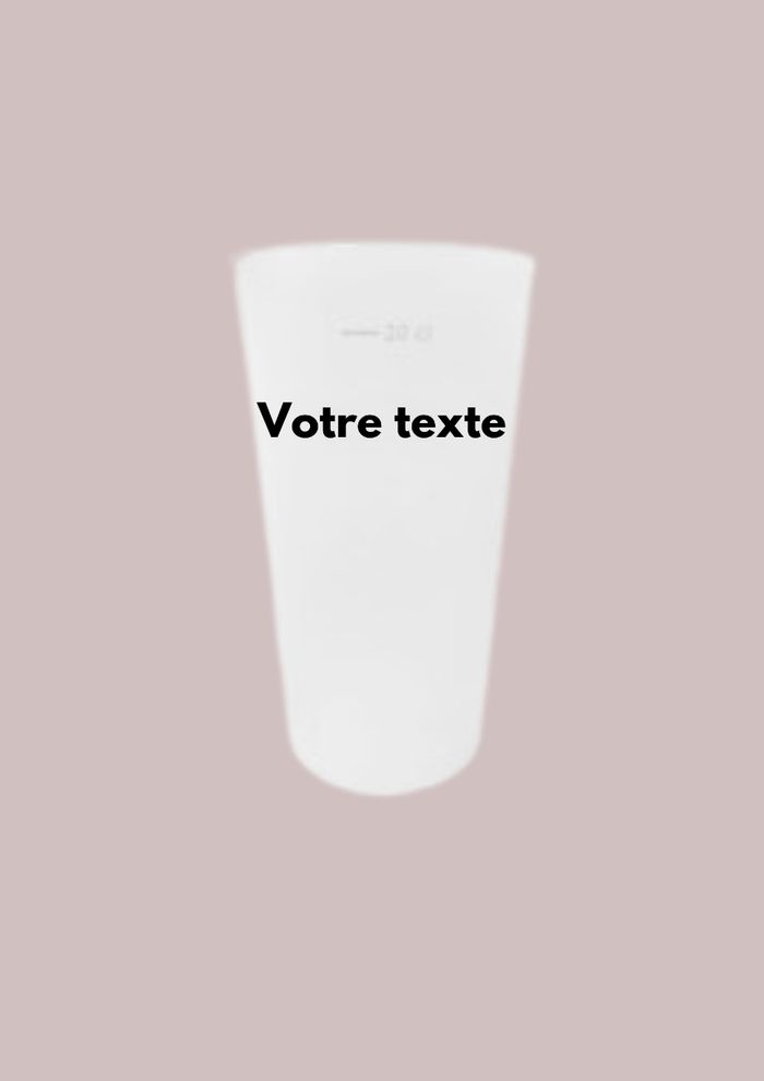 Eco cup 200ml 100 % personnalisable avec votre texte et/ou un motif. Prix pour 1 texte : 0,40cts le gobelet Prix pour 2 textes (2 lignes): 0,60 cts Prix pour 1 texte et 1 motif: 0,75 cts Prix pour 2 textes et 1 motif: 0,80cts Si prénom personnalisés à chaque gobelet +0,20cts. Nous voyons ensemble la police et la taille d'écriture et le motif si vous en souhaitez un. Le lavage au lave-vaisselle est déconseillé, lavage doux à la main recommandé. Après personnalisation aucun retour ne sera accepté.