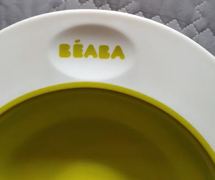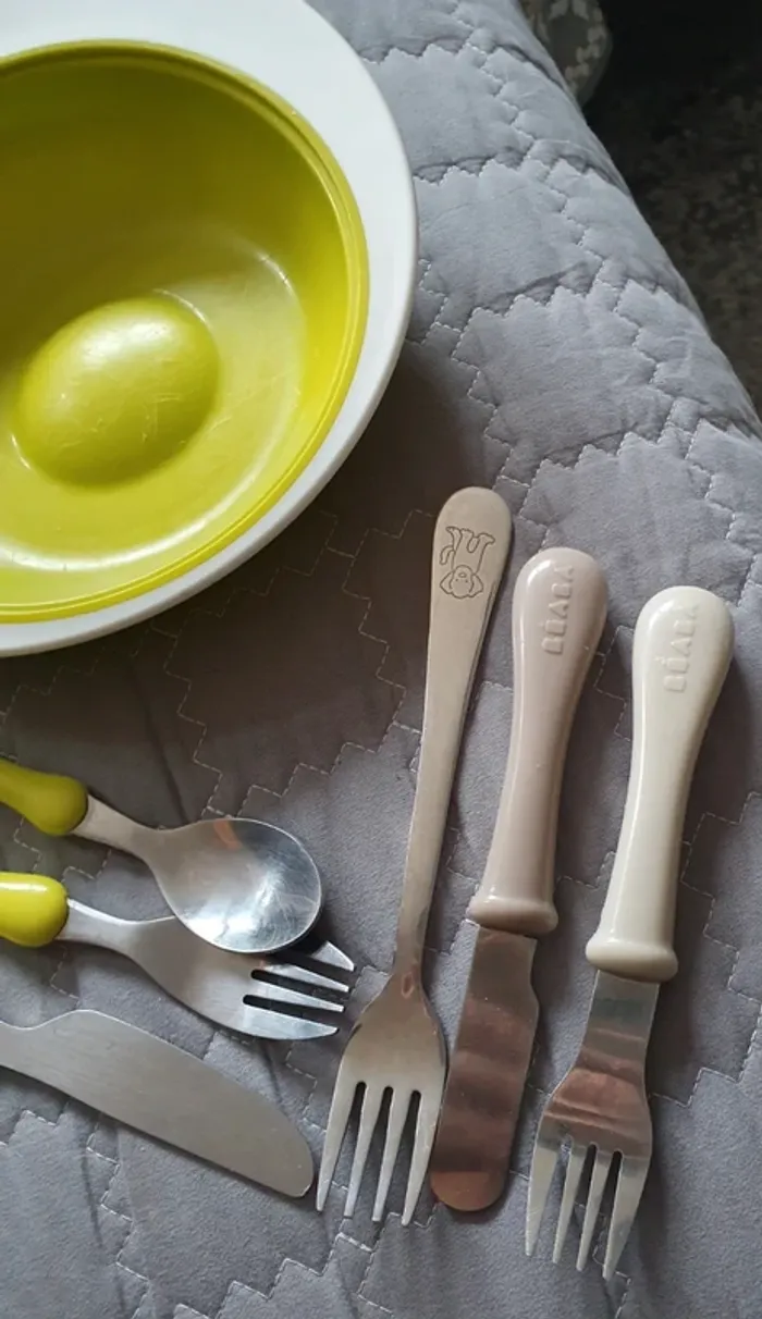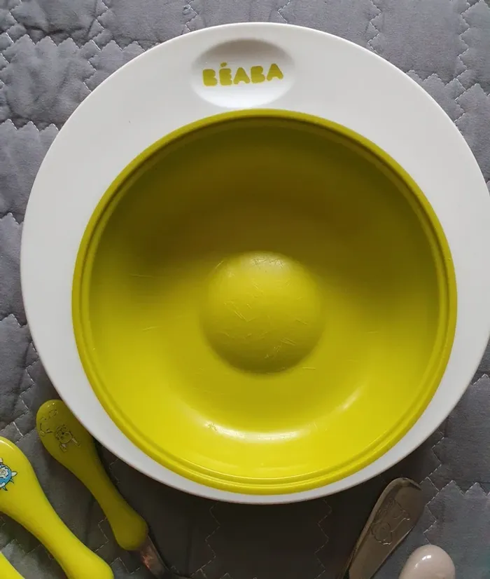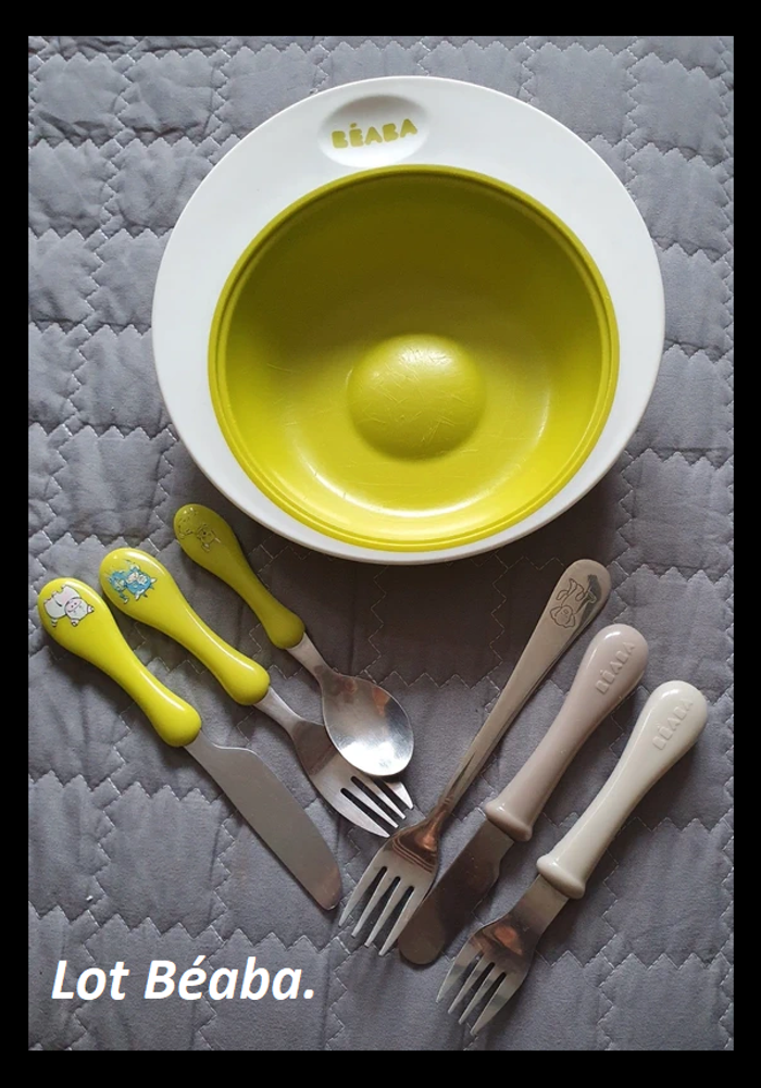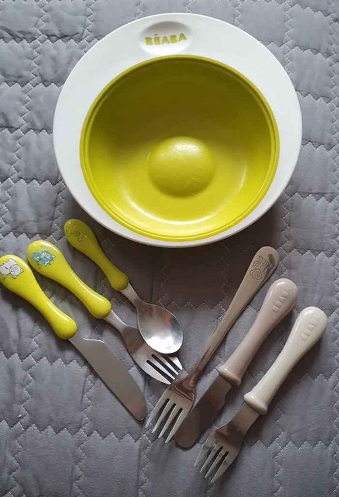 Lot une assiette verte et blanche de la marque Béaba et ses couverts Béaba 3 fourchettes, deux couteaux et une cuillère. Le tout en très bon état malgré quelques rayures au font de l'assiette mais qui ne gêne en rien d'y mettre le repas de bébé.