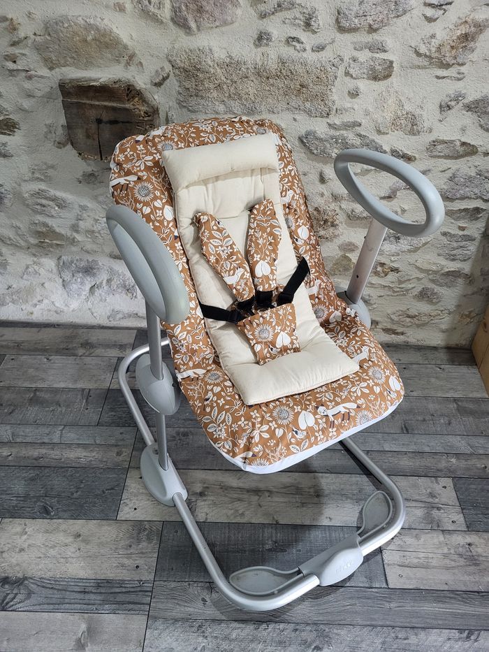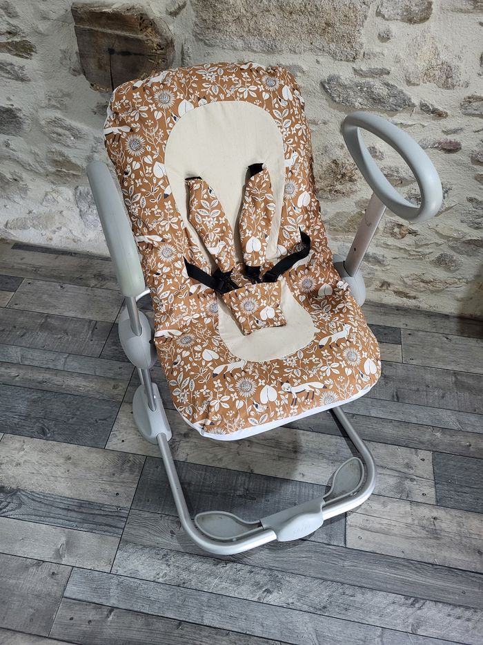 Housse qui s'ajoute à l'assise d'origine du transat up and down de béaba . Imprimé animaux sur fond terracota/ écru. Coussin réducteur et Accessoires sangles et entre jambe assortis. Lavable en machine à 30° Page fb Zol&Saan confections Insta zolsaan.