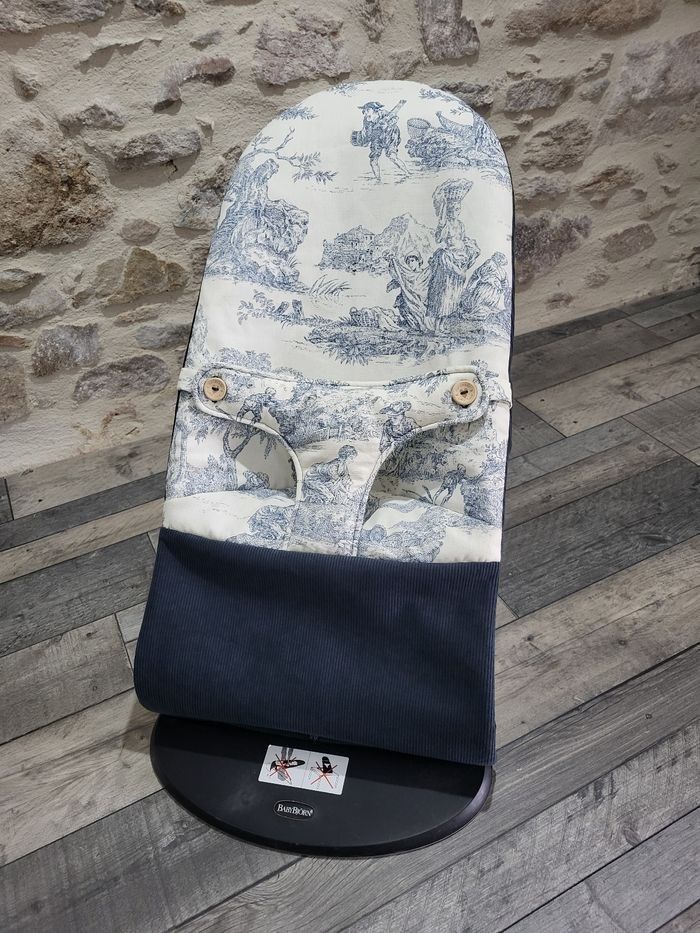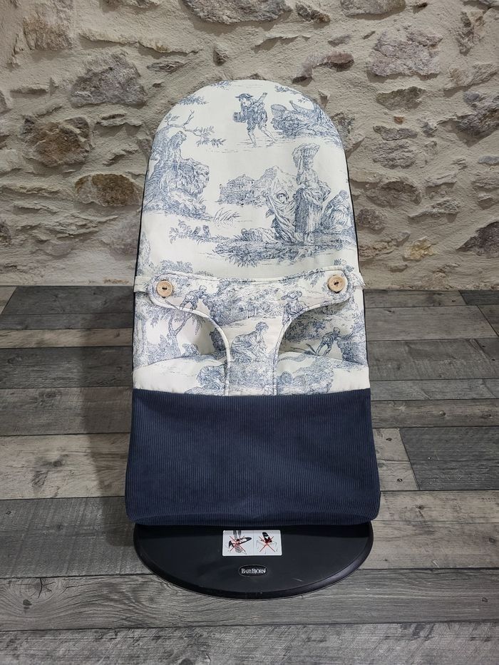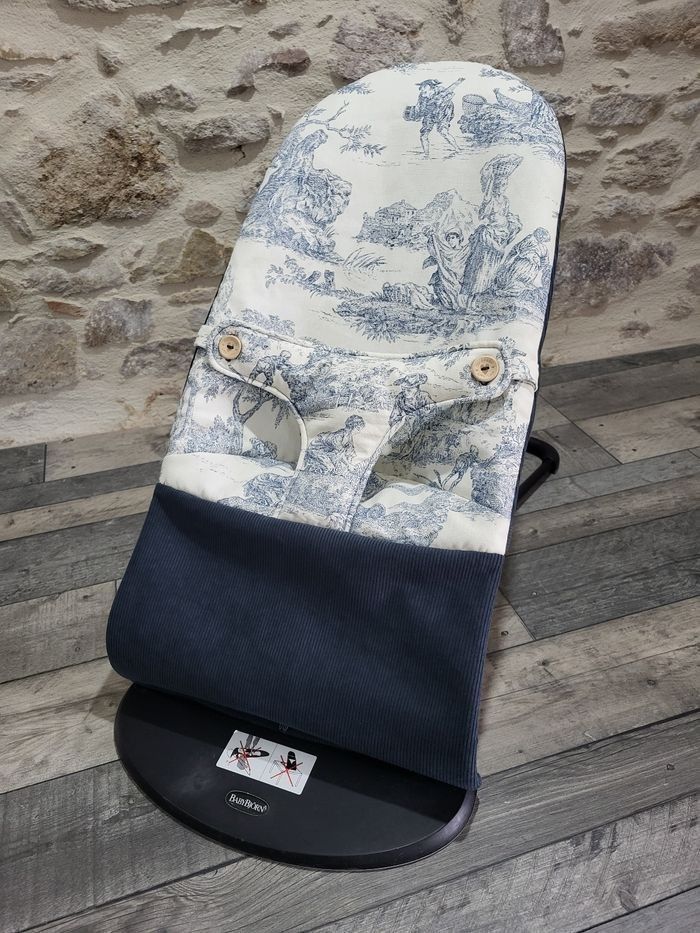 Housse transat babybjorn. Elle remplace totalement celle d'origine. Toile de jouy/ velour côtelé bleu marine . Lavable en machine à 30° Page Fb Zol&Saan confections Insta zolsaan.