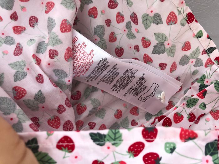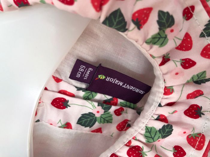 Blouse Sergent Major, Taille 6 mois/ 68 cm, 100% coton, Manches courtes, Le haut est doublé. Adorable blouse crème, motifs fraises de bois, feuilles et fleurs dans les tons roses, rouges et verts. Col en collerette/ volant, Médaillon souris. Ouverture tout le long du dos avec de jolis boutons en forme de fleurs, en métal. En très bon état, pas de trou ni d’usure du tissu. Malheureusement il y’a quelques tâches roses d’un vêtement qui a déteint dessus. En haut du dos, il y a une zone rosée, et sur le coté droit une petite tache. Cf photos. C’est plutôt discret parce que ça se confond avec les fraises. 🌸 Vous aimez cet article ? N’oubliez pas de visiter le reste de mon dressing en filtrant les tailles.