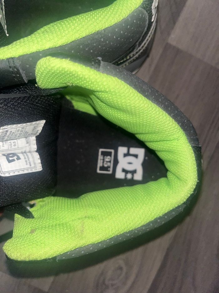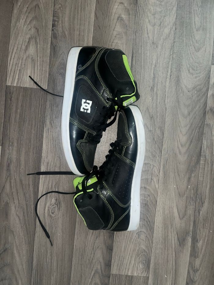 Chaussures montantes DC Shoes en noir avec des accents verts. Présentent des signes d'usure légers sur le talon. ⭐️ État : 6/10 (usure visible sur le talon) 🎨 Couleur : Noir et vert 📦 Livraison rapide et soignée (prix négociable)