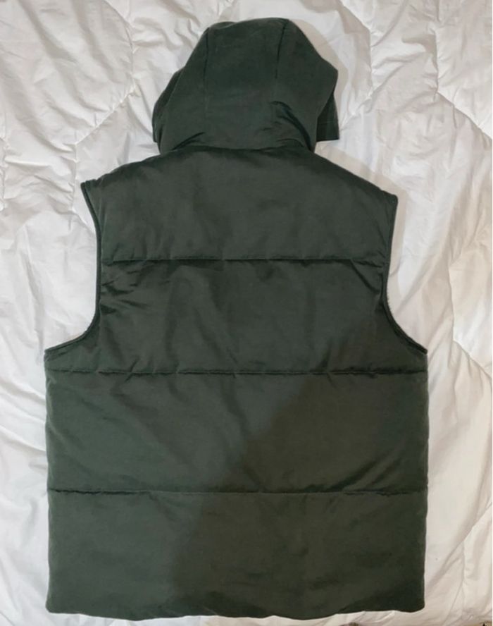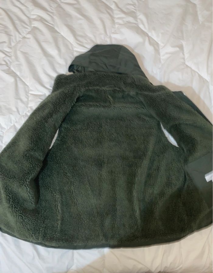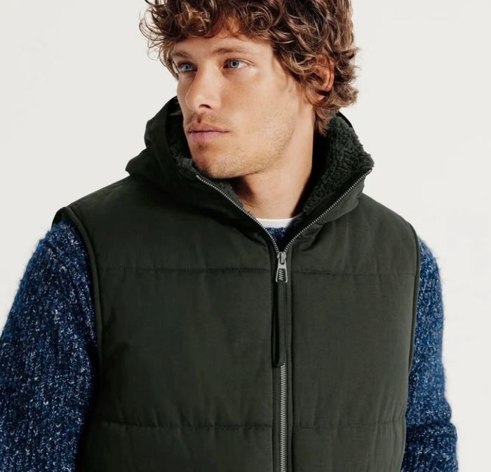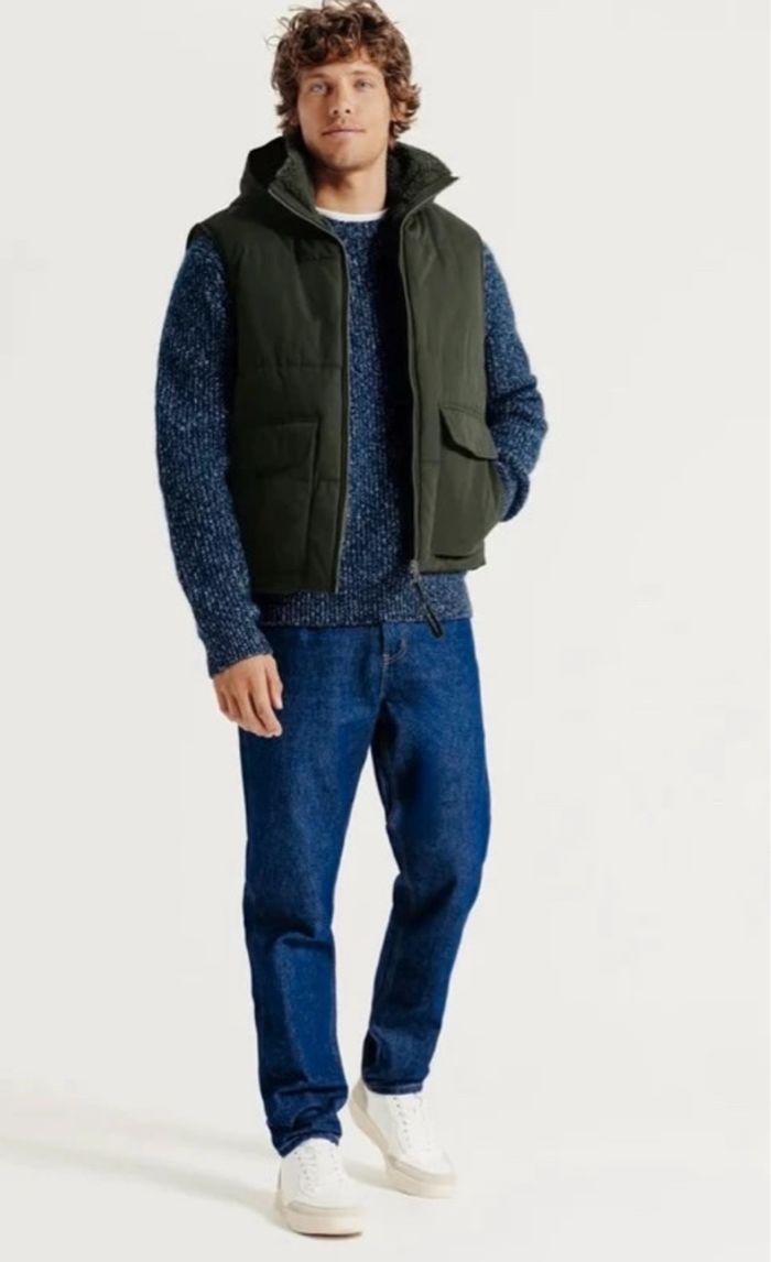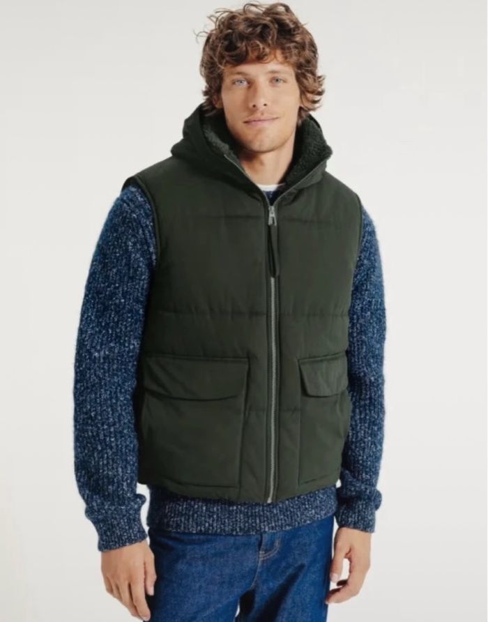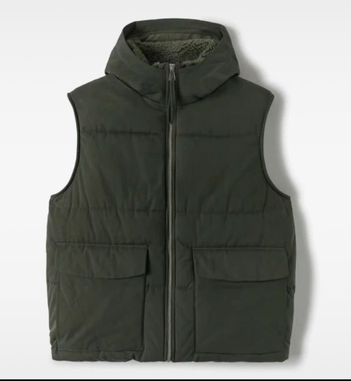 Doudoune sans manches capuche homme Jules - Coloris kaki militaire Cette veste sans manches de la marque Jules est parfaite pour la mi-saison ou en superposition l’hiver. Elle combine style outdoor et confort grâce à sa doublure intérieure en sherpa ultra douce qui garantit chaleur et bien-être. Caractéristiques : • Marque : Jules • Couleur : Kaki/Vert militaire • Capuche ajustable avec cordon de serrage • Fermeture éclair centrale robuste ton sur ton • 2 grandes poches plaquées à rabat sur le devant (style cargo) • Doublure intérieure en sherpa polaire épaisse et chaude • Matelassage horizontal sur l’extérieur • Coupe droite et confortable • État:neuf sans étiquette.