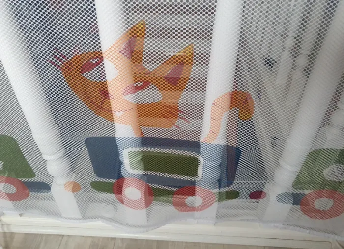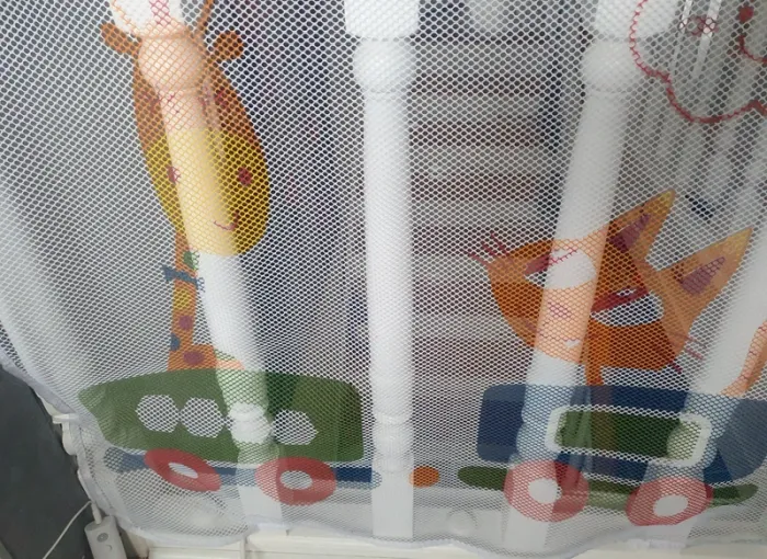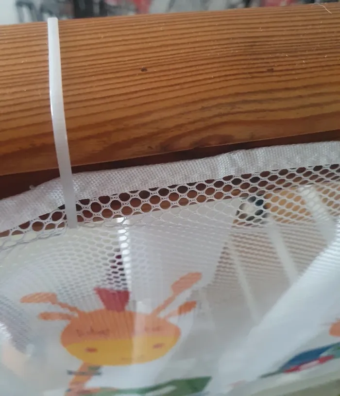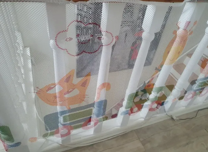 Filet de sécurité enfants pour barrière/rampe d'escalier avec motifs train et animaux. Le filet est blanc et les motifs multicolore. Il est en 3 partis. 1 partis de 300 cm + 1 partie de 147 cm + 1 partis pour la porte de 152 cm sur 78 cm de haut. La partis du filet du portillon a été coupé sur un côté pour obtenir la longueur. En super état. Peu être laver en machine. Les attaches serflex blanc seront à acheter à part ils en faut environ 20 pour en haut et 20 pour le bas car ceux que j'ai utilisé seront coupé pour décrocher le filet. Voir toutes les photos. Utilisé plusieurs mois mais reste en super état, n'y tâches, n'y déchirures.