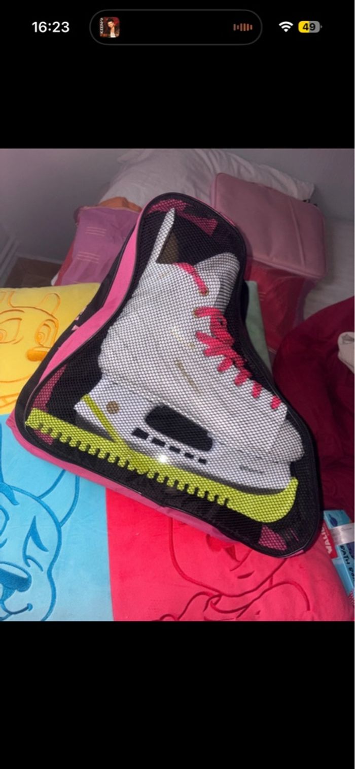 Je vend des patins de hockey/ patins à glace en très bon état Inclu avec les patins: Protège lame Lacets sur paire + lacets d’origine Sac de rangement ( en bon état )