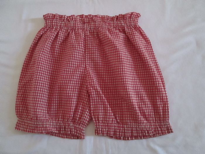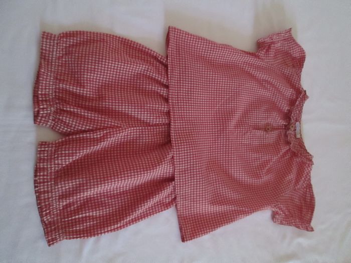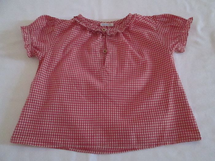 Vends tunique en vichy Bout'chou + short. Tunique avec petit volant autour du cou, bras élastiqués. Short avec volant autour de la taille et aux cuisses. Tunique et short en 100 % coton. Taille 18 mois. Excellent état. Pour plus de choix, allez consulter mes autres annonces.
