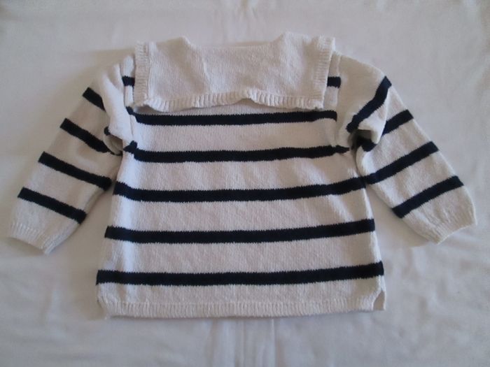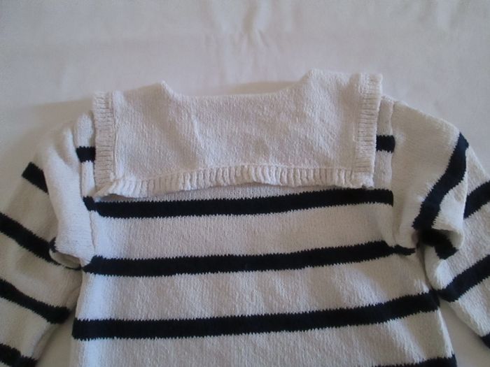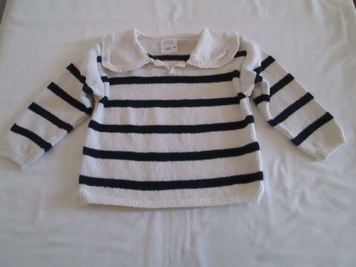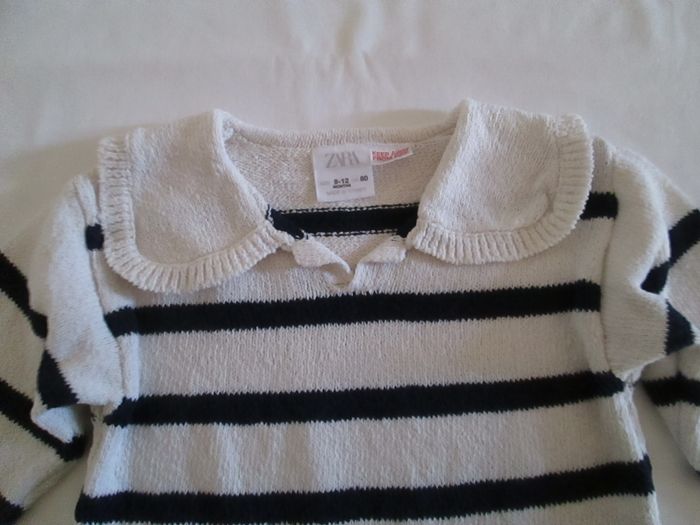 Vends pull rayé Zara avec col. Crème, rayures marine. 77 % coton + 23 % polyester. Taille 80 cm. Excellent état. Pour plus de choix, allez consulter mes autres annonces.