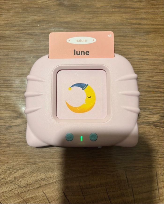 Jeux éducatif pour apprendre les premiers mots Il y a 101 cartes recto verso donc + de 200 mots à apprendre Il y a juste à l’insérer comme la deuxième photo pour que celui ci dise le nom qu’il y a sur la carte En parfait état, très peu utilisé