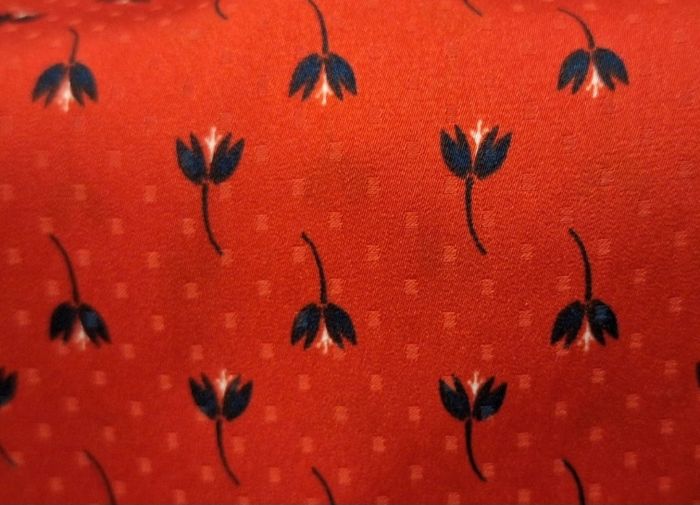 Col en V, épaules dessinées, taille élastiquée. Petits boutons à la poitrine. Hauteur 67 cm. Rouge à fleurs noires et blanches.