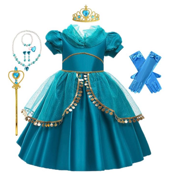 Déguisement robe princesse Jasmine et ces accessoires (gant, couronne, baguette, bijoux). 1 taille disponible : - 3-4ans : longueur de la robe 65cm, Vendu dans leur pochette d’emballage d’origine, idéal pour faire un cadeau ! Expédition rapide après votre commande.