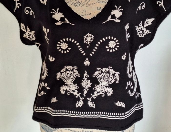 Joli imprimé en relief devant, on dirait des broderies. Col en V. Coutures écru de contraste à la base, aux manches et au col. En 100 % coton.