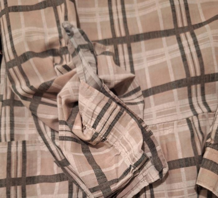 Manches longues avec des languettes pour pouvoir les raccourcir. Poignets boutonnés. Toute boutonnée devant. Taille marquée. Aisselles un peu passées. Hauteur 90 cm. En coton et élasthanne. Taille L.