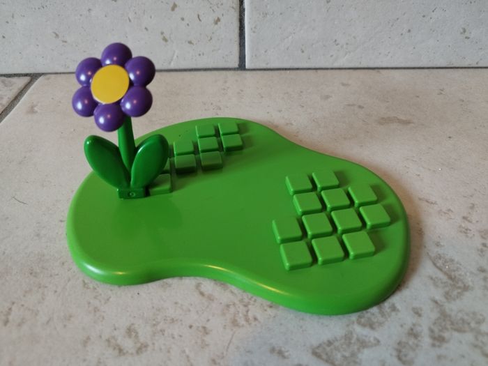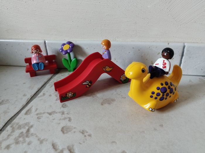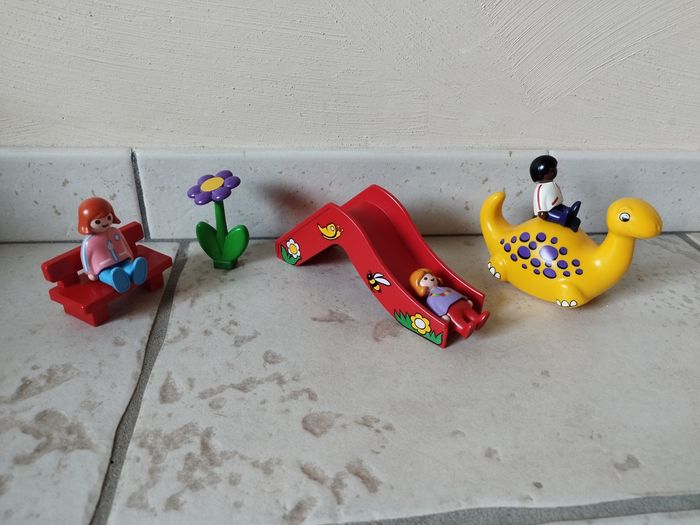 Bonjour, je vends un ensemble complet Playmobil 1 2 3 6748 Parc d'enfants, sans emballage d'origine. Il y a 3 personnages, un socle vert et une fleur, un toboggan, un dinosaure qui balance et un banc. A partir de 18 mois.
