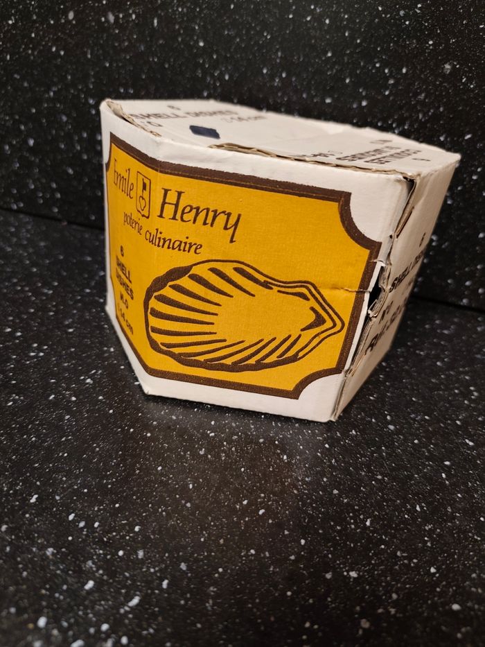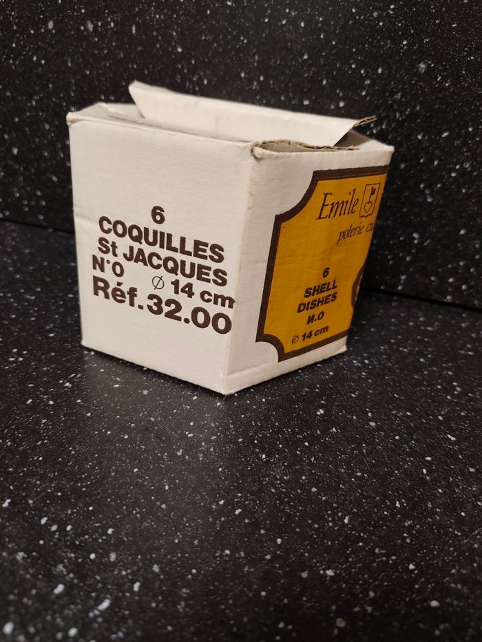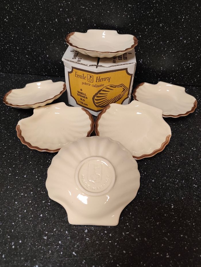 Lot de 6 plats / caquelons / coquilles Saint-Jacques en Grès / céramique allant au four Shell dishes Diamètre 14 cm Émile Henry + 2 en verre transparent En très bon état , avec la boîte d'origine 📌 Envoi rapide et soigné 📌 Maison non fumeur et sans animaux Il s'agit d'objets d'occasion ayant donc déjà servi, ils peuvent parfois présenter des traces d'usage et d'usure , merci de bien regarder les photos .