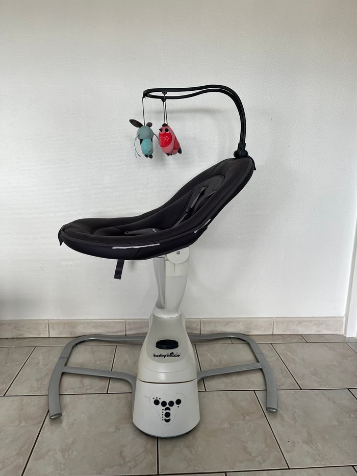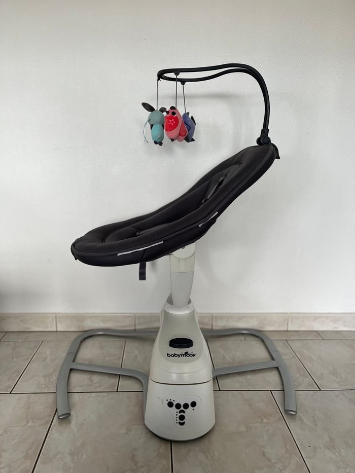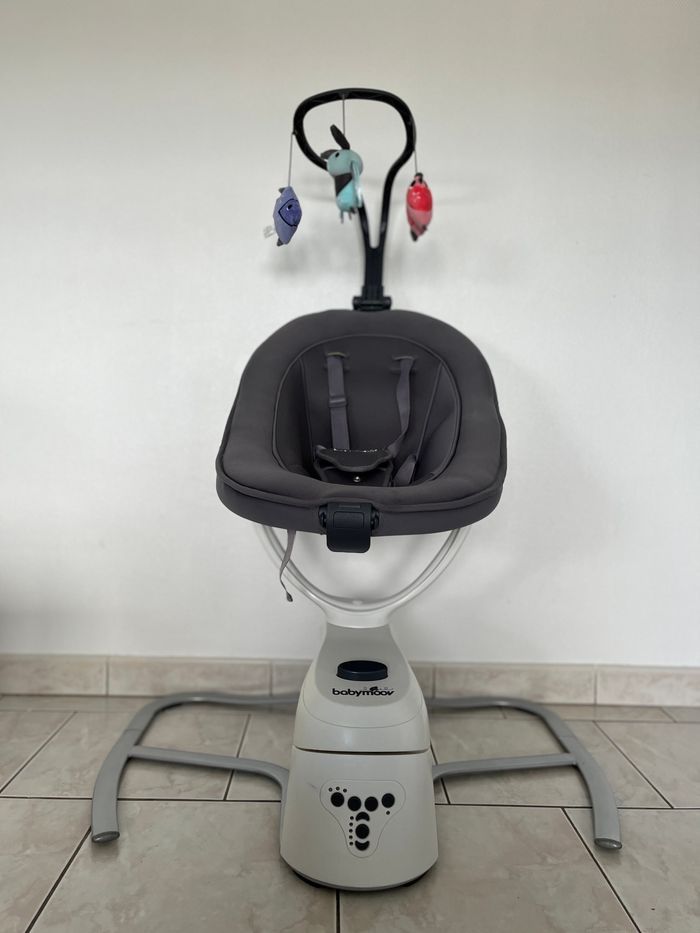 Babymoov balancelle, avec arche ajustable, 3 jouets sensoriels, assise et dossier ajustable et rotatif, 8 berceuses, programmation du bercement, détecteur de mouvement et volume réglable.