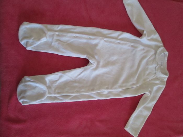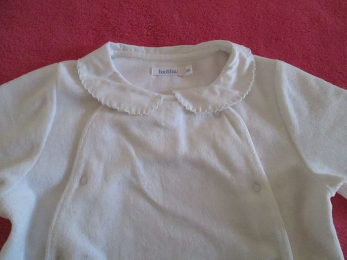 Vends pyjama blanc Bout'chou avec col. 75 % coton + 25 % polyester. Taille 18 mois. Comme neuf. Pour plus de choix, allez consulter mes autres annonces.