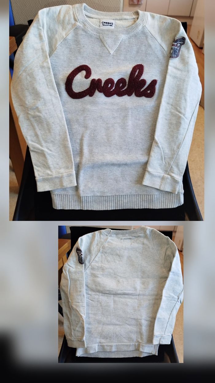 Pull creek gris claire 8ans Etat: des pluchette a etait portee Ps: sur la photo petit deffaut un petit trait de sylo Renseignez vous