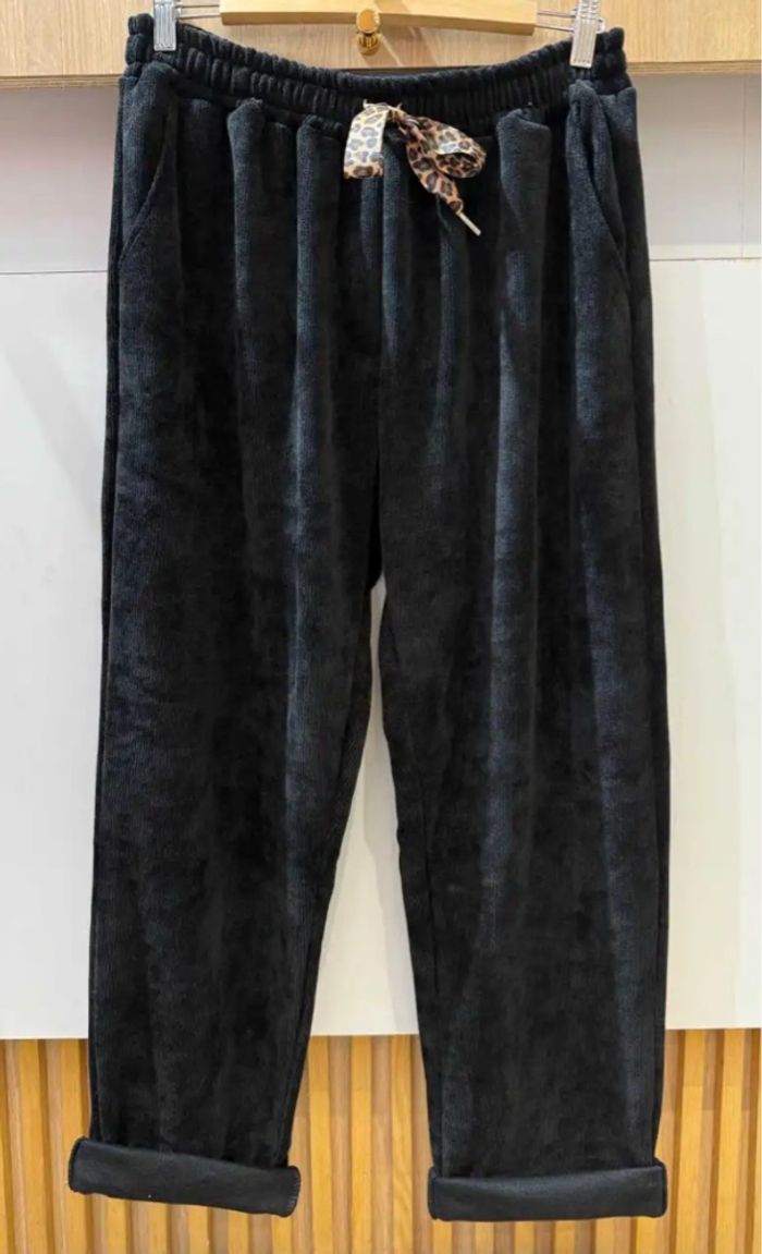 En velours extensible noir , très confortable, taille élastique avec lien à nouer , poche de chaque côté Taille unique 44/48 Longueur totale 105 cms