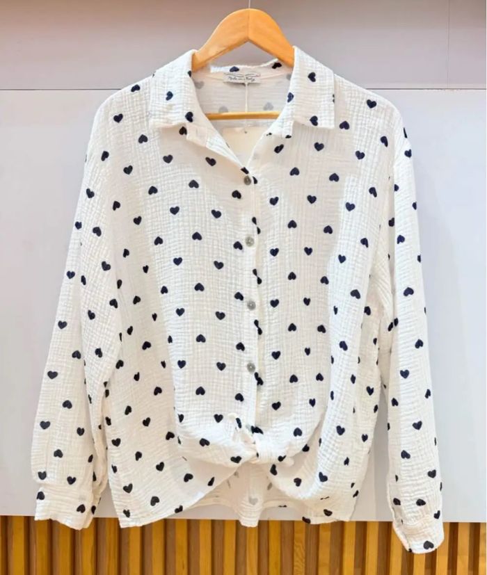 Magnifique chemise blanche avec cœur marine en gaze de coton , manches longues , entièrement boutonnée Taille unique qui va du 44 au 48 Largueur sous aisselles 70 cms