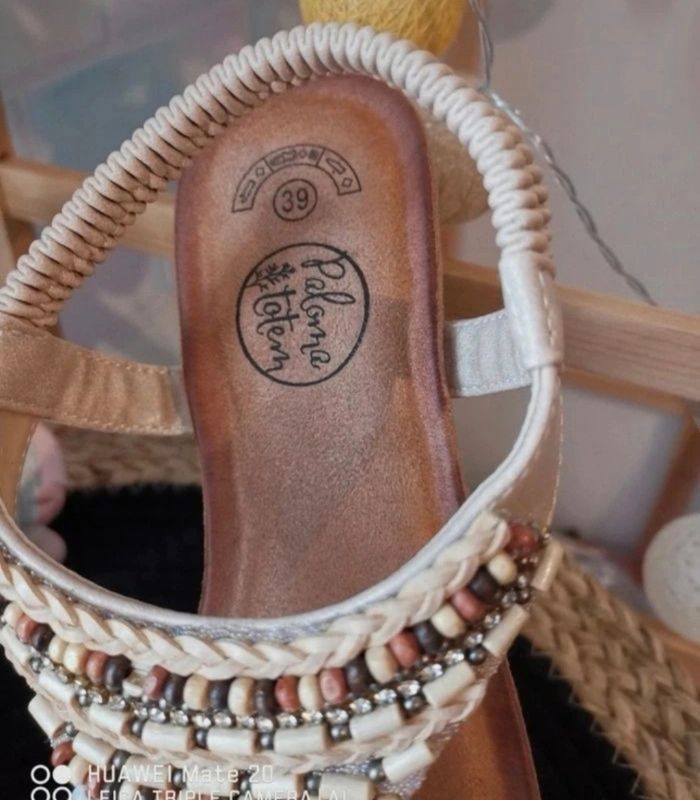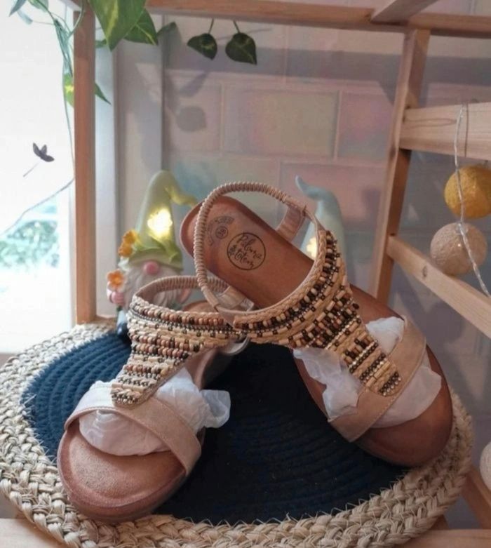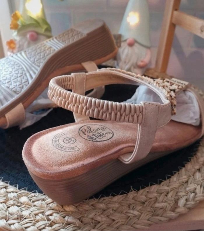 Jolies sandales compensées perles bohème Paloma Totem femme P39 ​Description ​✨ Magnifiques sandales d'été de la marque Paloma Totem ✨ ​Idéales pour un look bohème chic ou pour une occasion (mariage, baptême, soirée d'été). Elles sont à la fois élégantes avec leur travail de perles et très confortables grâce à leur semelle compensée et leur bride élastique. ​Détails de l'article : • ​✅️ État : Neuf (avec étiquette de prix sur la boîte). • ​📏 Taille : 39. • ​🏷 Marque : Paloma Totem. • ​🎨 Couleur : Beige / Sable avec détails de perles bois et dorées. • ​Hauteur talon : Talon compensé moyen (confort optimal pour marcher toute la journée). • ​Fermeture : Bride arrière élastiquée pour un enfilage facile et un bon maintien. ​Les + de la boutique : 🚭 Maison non-fumeur. 📦 Envoi rapide et soigné. 🤝 Réductions sur les lots activées ! N'hésitez pas à parcourir mon dressing pour rentabiliser les frais de port. ​#ribeirozazafemme39 #ribeirozazachaussures39 ​#palomatotem #sandalesfemme39 #sandalesperles #BohoChic #styleboheme #chaussuresete #sandalescompensees #Mariage #Occasion #NeufAvecBoite #femme39 #ete39 #sandakesfe#ribeirozazafemme39 #ribeirozazachaussures39 #39ete #39femme